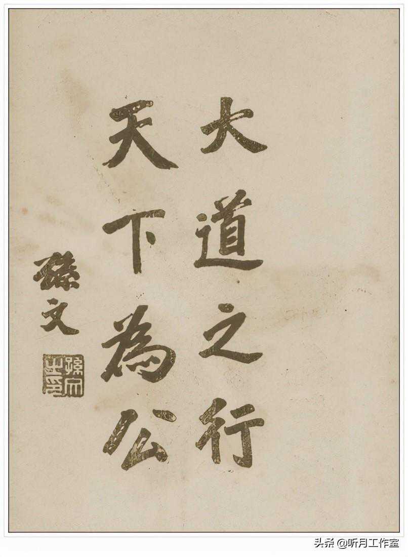 孙中山《楷书大道之行天下为公》题款:孙文。孙中山为《良友》题词,刊于1927年。孙中山书法的典雅精妙,别具一格,而且字里行间中也透露出孙中山独特的人格魅力。