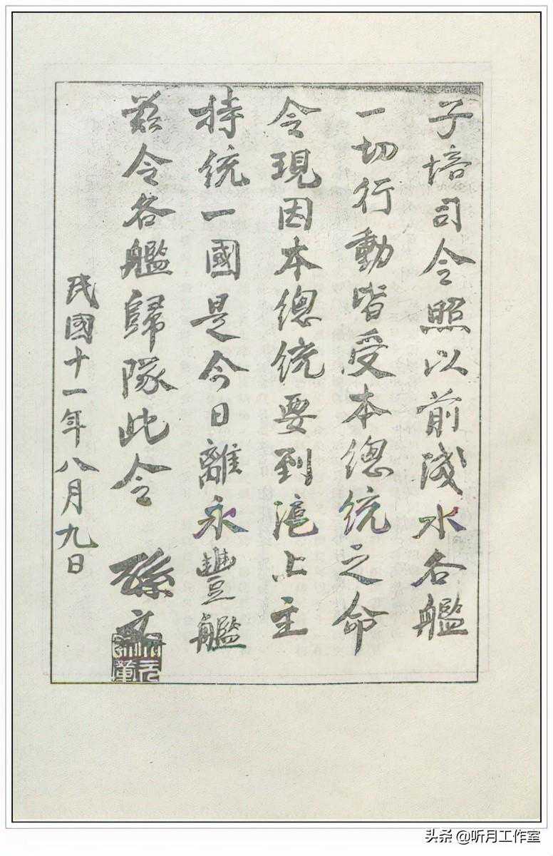 孙中山《行书给温树德(子培)的命令》释文:子培司令,照以前,(浅?)水各舰一切行动皆受本总统之命令,现因本总统要到沪上主持统一国是,今日离永丰舰。兹令各舰归队。此令。孙文。民国11年8月9日。上述浅水各舰是否与深水各舰对应,人工读字,(浅)这个字拿不太准,望指教。这是孙中山离开永丰舰到上海主持统一国是,给温树德(子培)的命令,命令各各舰归队,1922年8月9日。