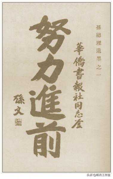 孙中山《楷书努力进前》努力进前,孙总理遗墨,孙中山为《华侨书报社》同志题词《良友》1927年刊出。华侨书报社同志金,努力进前,孙文。