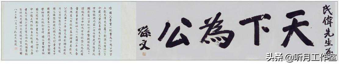 孙文《行书天下为公》卷37.8×127.4cm台北故宫博物院藏。本幅榜书“天下为公”四字,据卷末孔德成跋文,为孙文赠与黎民伟所书。黎氏曾追随孙中山,此为当时摄制新闻纪录片而用。中山先生喜书“天下为公”,世多有之,而此幅为南京中山陵正门所勒刻的原本,笔力雄浑,气势磅礡,弥足珍贵。沈昌焕夫人黎兰女士于1997年捐赠予台北故宫博物院。