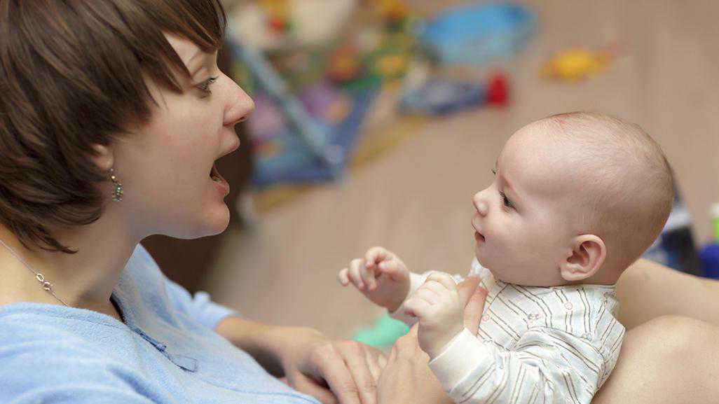 妈妈经常温柔且充满爱心的和宝宝说话,宝宝对妈妈的声音最敏感,平时照顾宝宝时,妈妈要多和宝宝说话,促进宝宝语言和听力的发育。