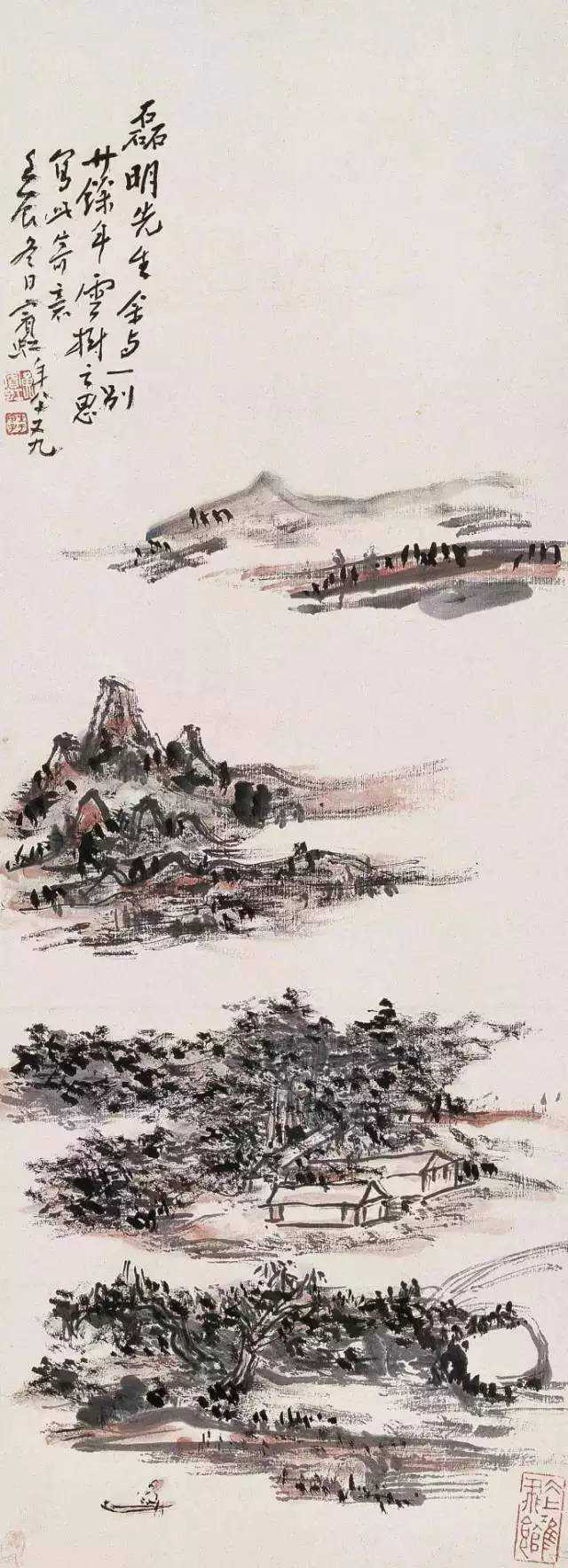 黄宾虹山水画风格的形成主要源自他对笔墨的特殊追求。在他的笔下,墨水已成为一种自然的精神,成为万物的荣耀。千变万化的山水已通过笔墨充分表现,有许多令人惊讶的水墨色彩,利用墨色变化形成了实中有虚、虚中有实的章法。