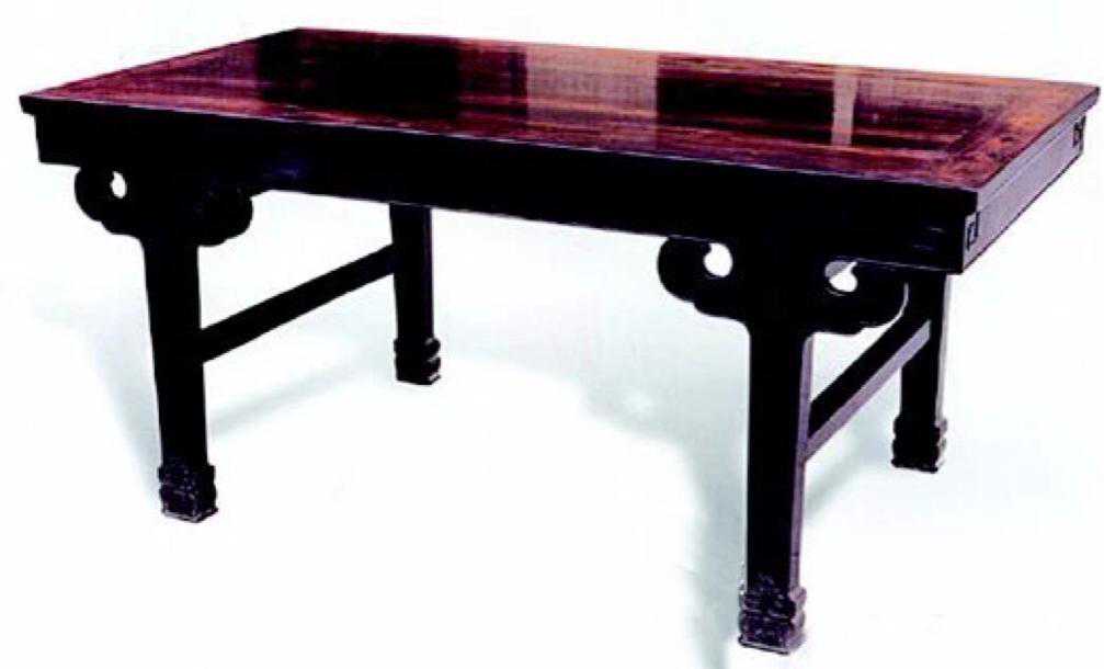 首先插入开口与斜肩下部拍合的,是用厚约寸许的整板挖出的向上卷转的四个云头。云头之上,再嵌插通长的牙条,与斜肩上部拍合。下一步是将案面抬起摆到支架之上,大边之下的榫眼,与每条腿子顶端的两个榫子拍合。最后安装两侧面的两条牙条,形成一具完整的大案。