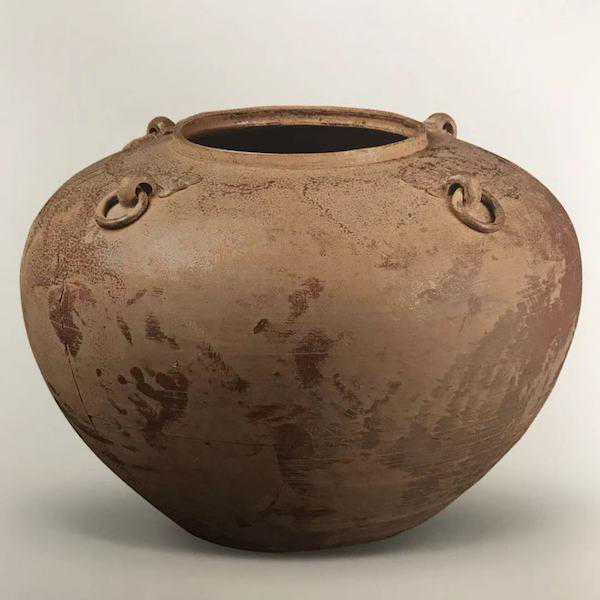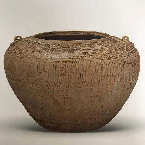 直口,溜肩,鼓腹。平底,肩部饰以两个对称铺首衔环,整器体型硕大,造型规整。肩部及上腹部饰以梳齿纹一周。器表施青黄色釉,胎釉结合良好,釉色匀润。
