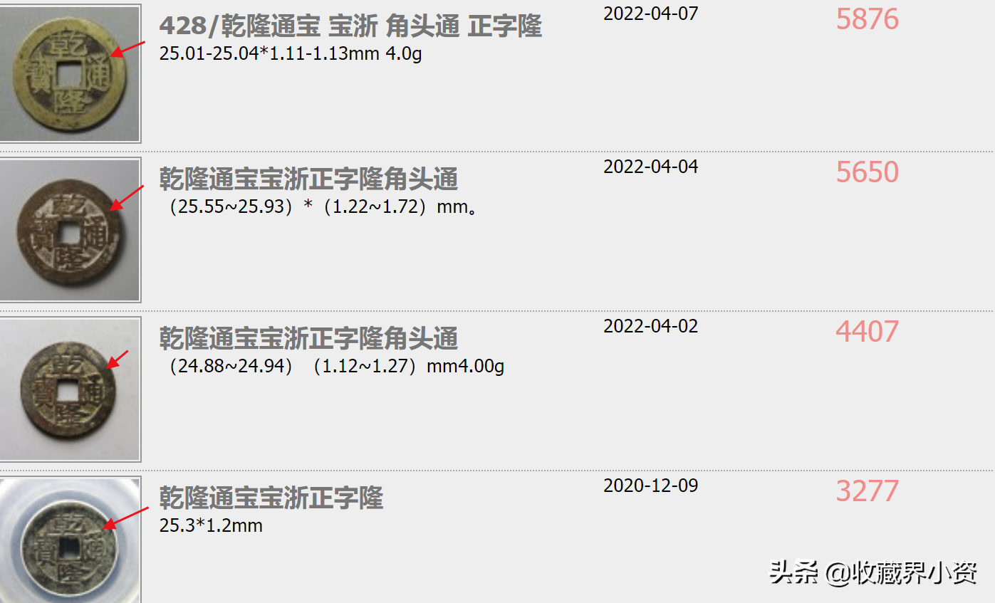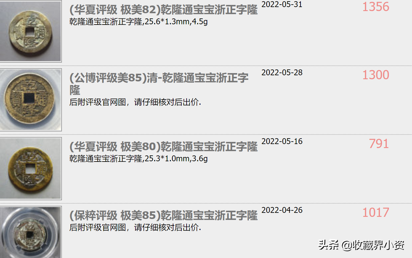 正字隆方头通和角头通很好区分,看“通”字通头即可辨认,至于正字隆大样,直径大于26mm直接认定为大样,大样在清钱中是很受欢迎的,玩儿清钱的都懂得;在收藏行情中,角头通的行情要比方头通高很多,大家对比下它们的行情: