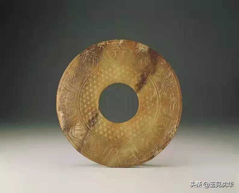 上图所示之玉壁,两面纹饰相同,内区饰蒲格涡纹,外区为阴线夔龙纹。