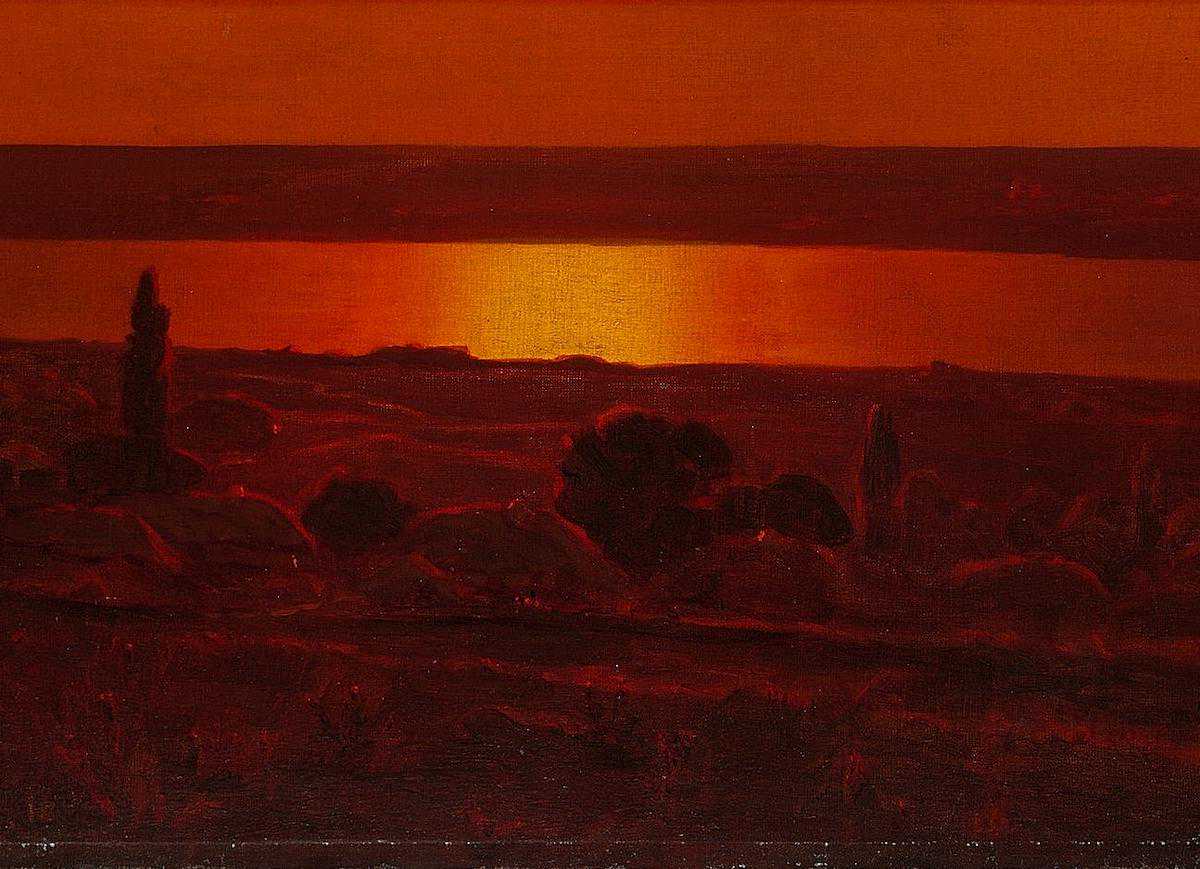 大都会艺术博物馆收藏的第二幅巡回画派画家作品是阿尔希普·库因兹的《第聂伯河上的红色夕阳》(1905-1908),这是一幅风景画的杰作。这幅画描绘了第聂伯河上日落的景色。库因兹使用了多种技巧来创造这幅画的戏剧效果。他用厚厚的颜料来营造质感,增强画面的亮度。他还使用了各种颜色,包括红色、橙色和黄色,来营造温暖和光芒的感觉。