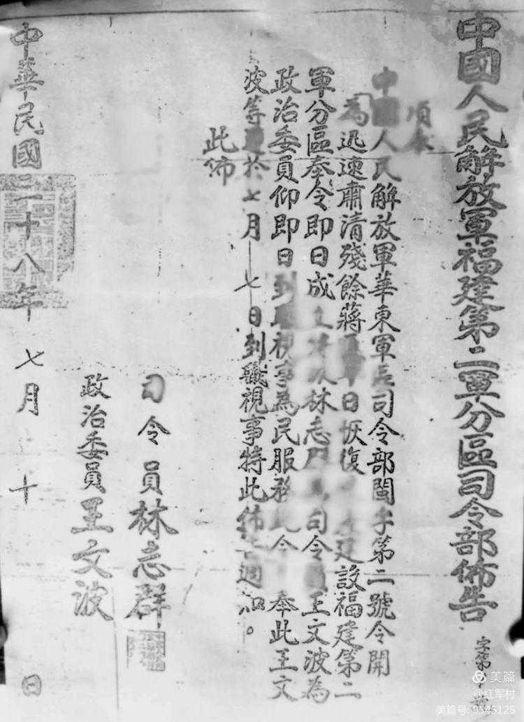 1949年7月10日,中国人民解放军华东军区司令部福建第二军分区司令部发布肃清国民党残匪的公告
