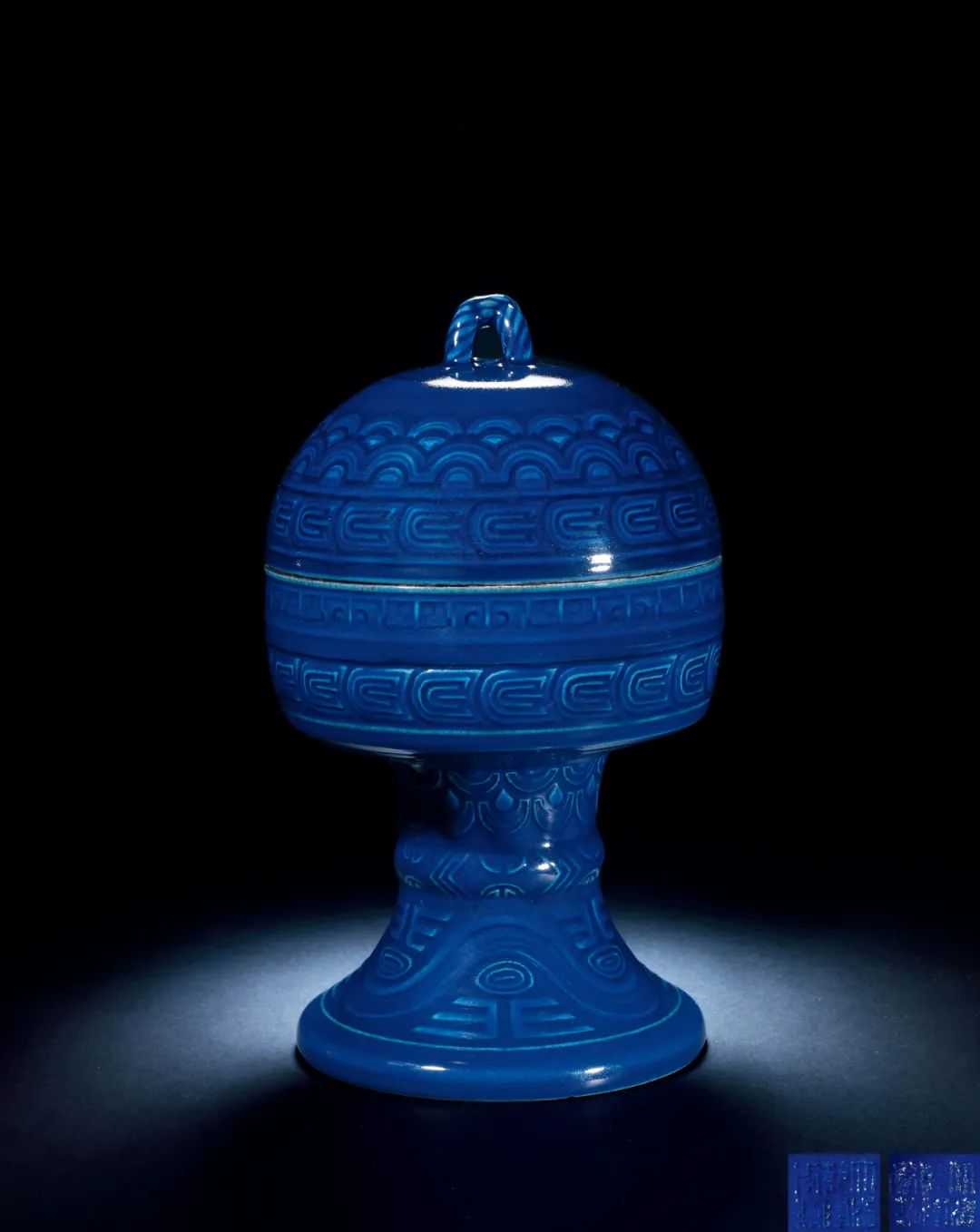 豆之器型,借鉴商周时期盛食器、礼器,此器通体罩施霁蓝釉,釉色深沉肃穆,质匀纯净,器身模印仿古青铜器纹饰,纹饰古朴丰富,格调典雅。霁蓝釉豆是乾隆十三年为天坛所定烧的瓷器新品种,其形制亦载于乾隆二十四年刻《钦定皇朝礼器图式》之中。美国大都会博物馆藏一组三件相似例,录于《AHandbookofChineseCeramics》,纽约,1989年,图版263-5。