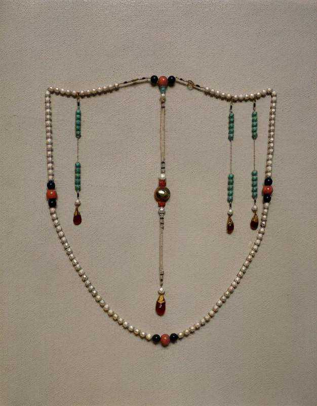 珍宝馆中展出了一件清顺治年间的御用东珠朝珠。据《清会典》记载,皇帝、后妃,文官五品、武官四品以上,皆配挂朝珠。而皇帝在不同场合亦会佩戴不同质地的朝珠。如皇帝在祭天时佩戴青金石朝珠,祭地时佩戴琥珀或蜜蜡朝珠,祭日时佩戴红珊瑚朝珠,祭月时佩戴绿松石朝珠。而东珠朝珠是所有朝珠中最尊贵的。据清代典章规定,东珠朝珠只有皇帝和皇太后、皇后在宫中举行大典时才能佩戴。