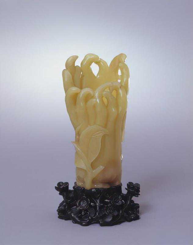 珍宝馆中展出的这件黄玉佛手花插,为清中期玉器的代表作。黄玉是玉石中最名贵的品种之一,其色泽由淡黄至深黄,最名贵的黄玉色泽纯正,材料极其难得。此件黄玉佛手花插,黄玉质地极佳,莹润如脂,是玉中的佼佼者。匠师将黄玉圆雕为立式佛手瓜,中空而成花插。器身外侧凸雕盘绕的枝叶,花插底部配有镂雕梅花纹木座。佛手本是植物,因其名中的"佛"字与"福"谐音,被当作吉祥物,常与桃及石榴一同出现并被称为"三多",即多福、多寿、多子。