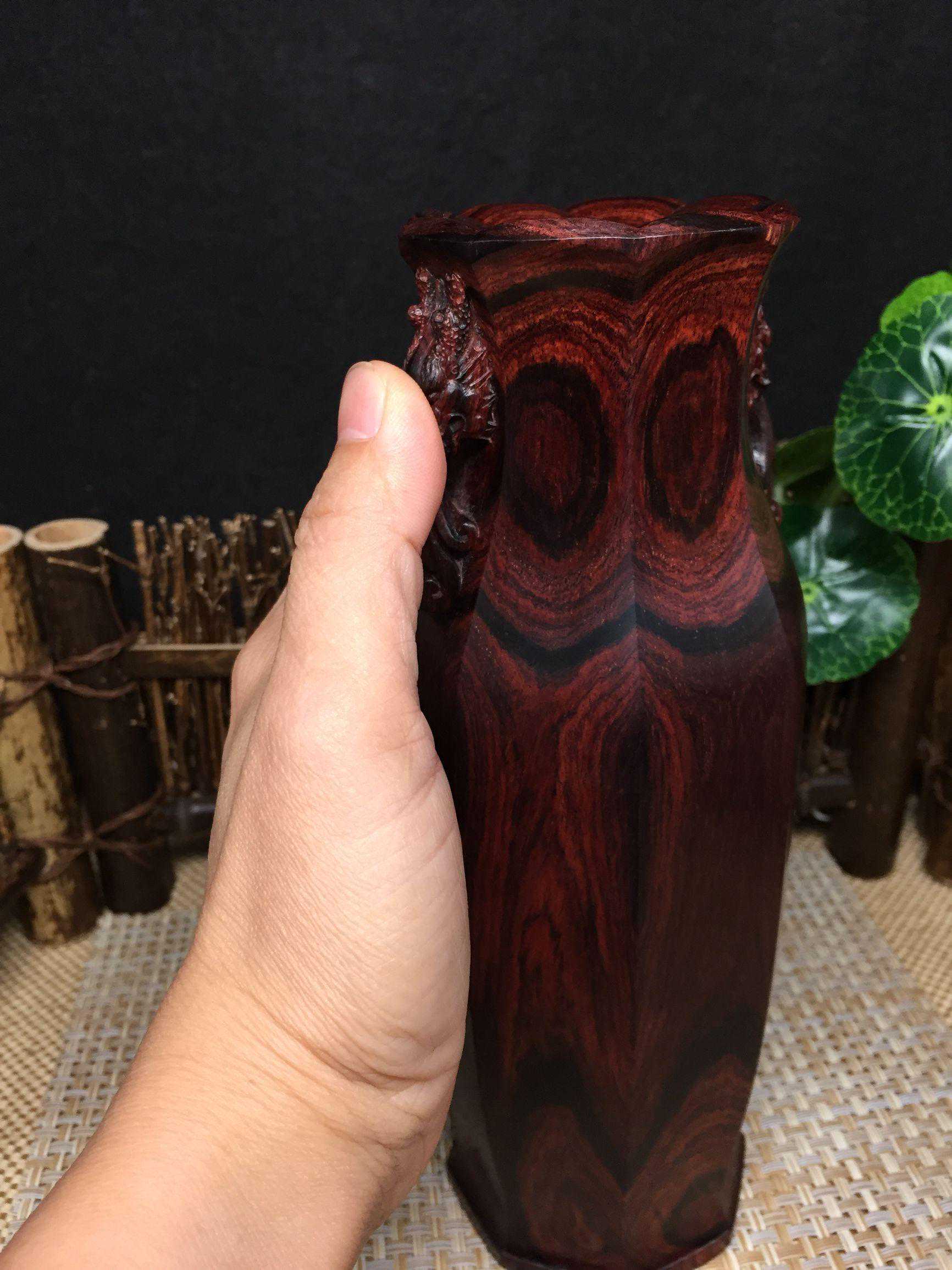 此件狮耳尊,取材自上等的海南黄花梨紫油梨老料,油性十足,质感温润,好似婴儿皮肤般细腻光滑。