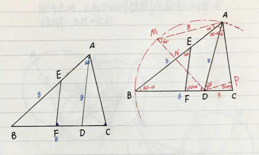 (4)如图作∠ADP=60º,边DP交AC于一点P,∴∠DPC=60º+α=∠C,∴PD=CD=3,易证:△ADP≌△AMN,∴MN=PD=3,EF=8-MN=5
