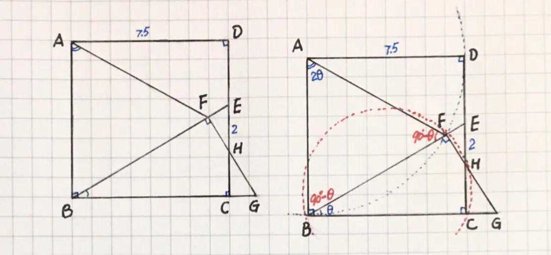【例三】(如图)正方形ABCD中,E点在CD上,连接BE,点F在BE上,使∠BAF=2∠CBE,且GF⊥BE交BC的延长线于点G,交CD于点H,若:EH=2,BC=7.5,求:线段CG的长