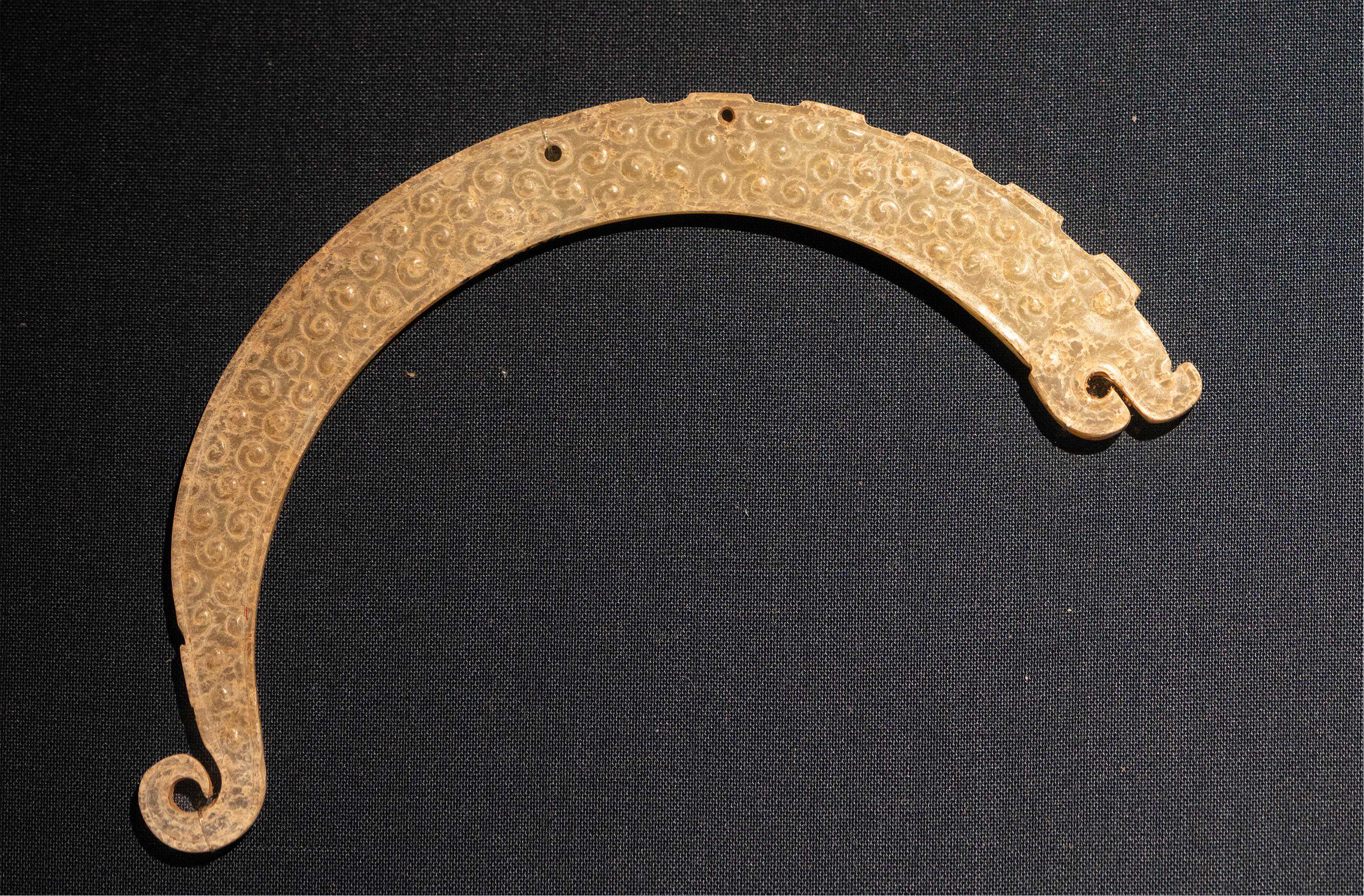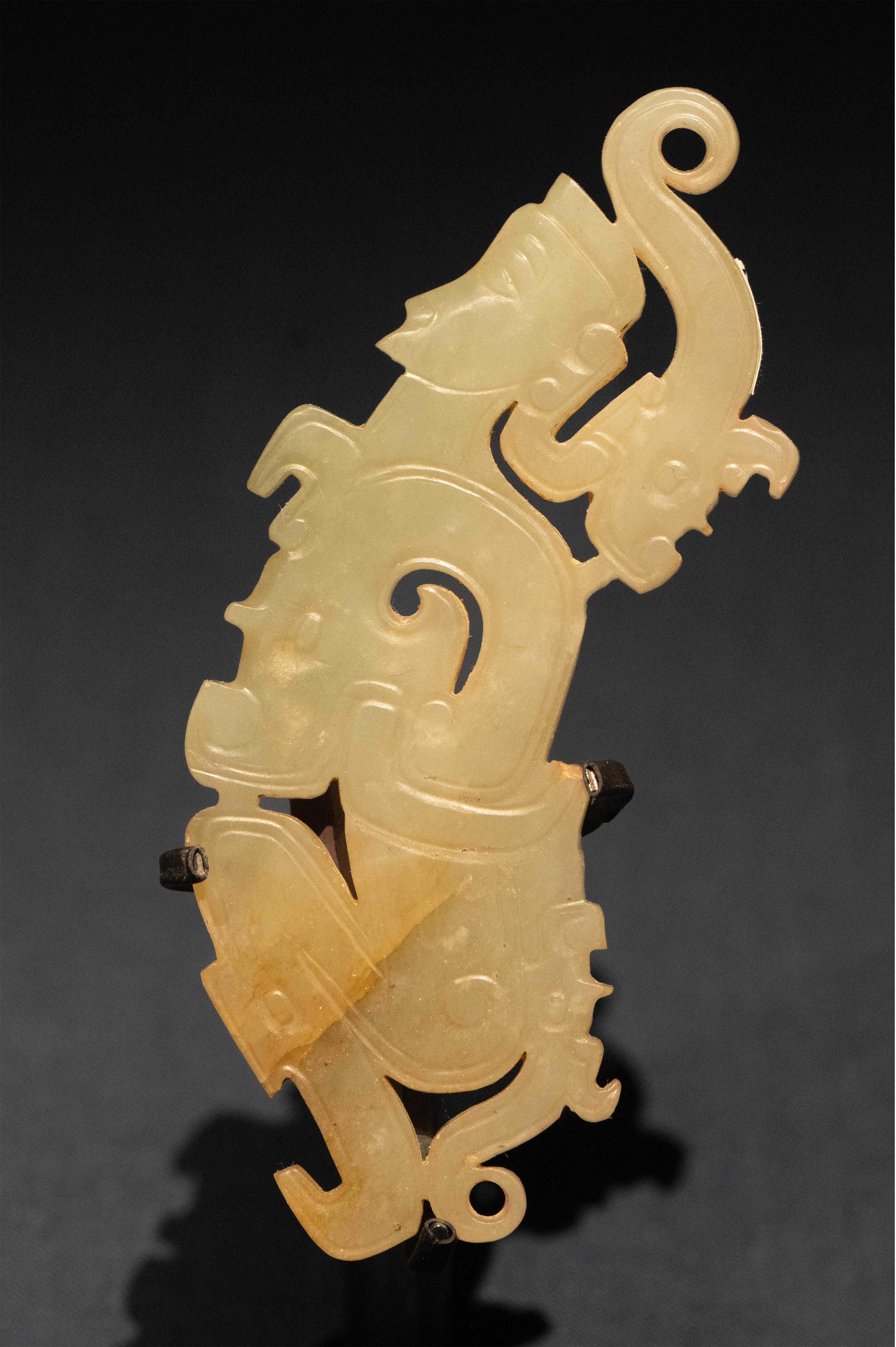 龙首形似兽,耳贴于颈部,上唇厚大,下唇尖细,嘴部镂空且刻有齿纹。璜身多饰以弧线勾连而成的龙身。