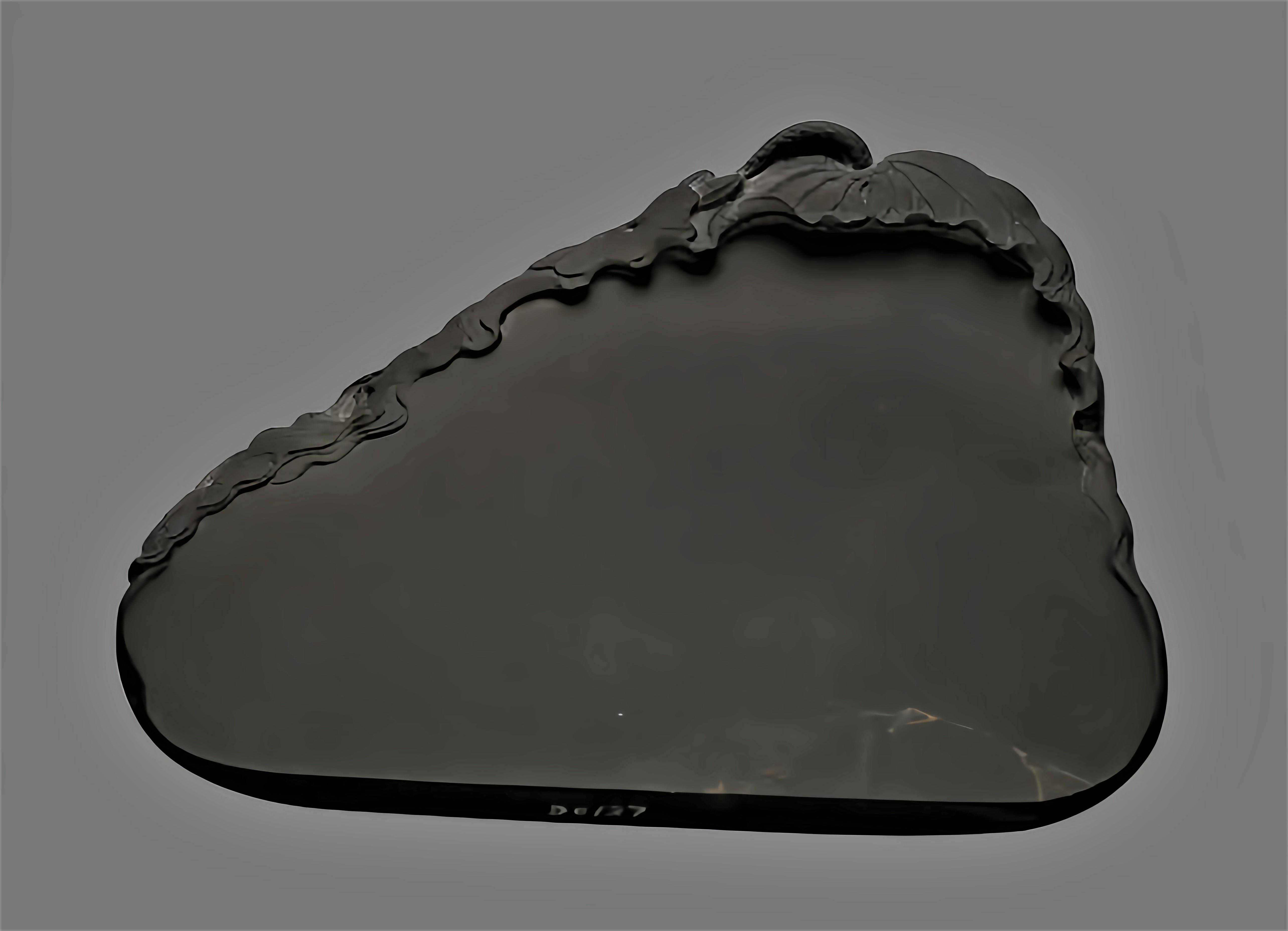 老坑石。石色青灰微带紫蓝而偏蓝。有火捺、玫瑰紫青花、黄龙纹等。随形雕作蕉叶,线条流畅。