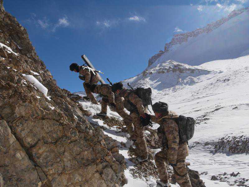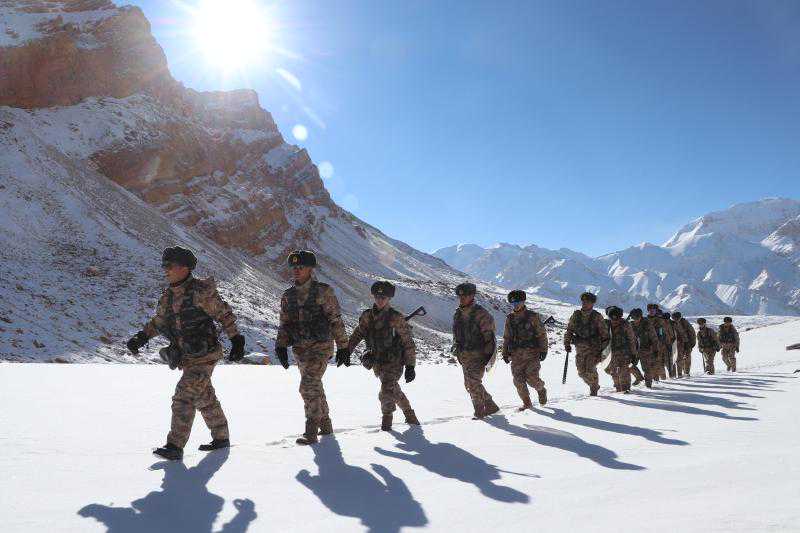 新疆军区某边防团5418米的河尾滩边防连官兵巡的画面。郭帅摄