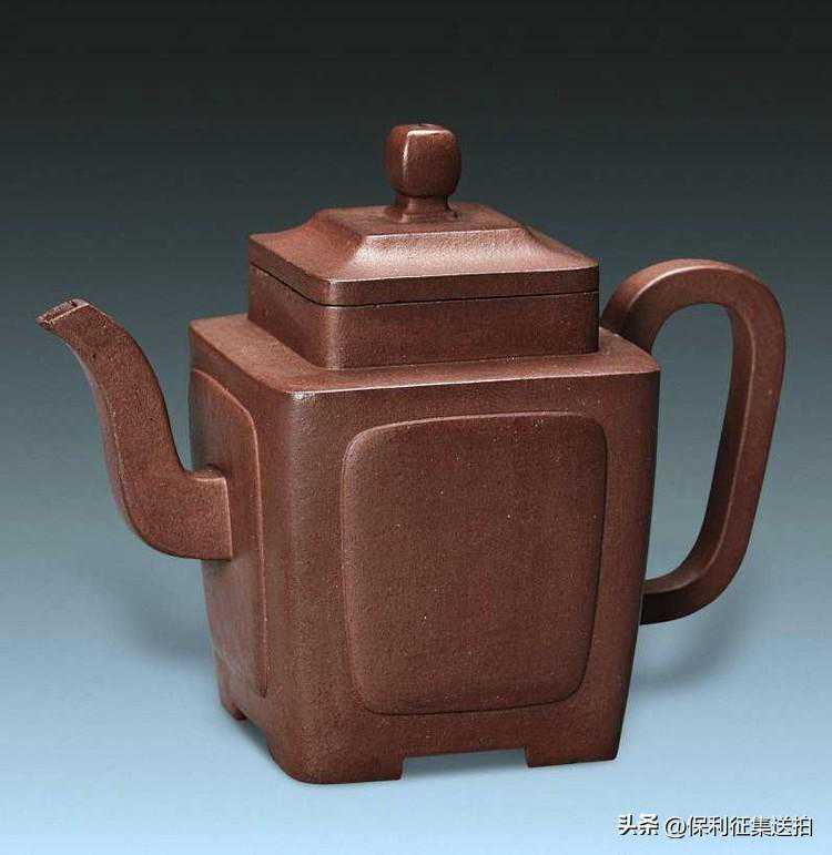 此壶材质为紫褐色泥,砂质隐现,造型寓圆于方,敦实厚重。弯曲流,环形把手,下附四饼形底足,制作精细,质朴大方,结构合理,用功独到。盖面鼓出,子口密缝紧凑,盖顶与壶身形制相若。这件是陈鸣远的代表作品,属几何形类的方器。此壶的饼形底足,在陈鸣远款紫砂壶上屡见,已形成一种特征,亦可作为赏鉴鸣远壶的依据。陈鸣远是继明代时大彬后最著名的壶艺大师。他鲜明的个人风格具有两大特点:既继承了明代器物造型朴雅大方的民族形式,又着重发展了精巧的仿生写实手法。他的作品塑镂兼长,构思脱俗,富于创新,并能自制自署,铭刻书法,古雅流利,被誉为“清代砂艺第一名手”。