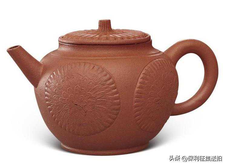 15,清早期段泥贴紫泥百合花卉大圆壶