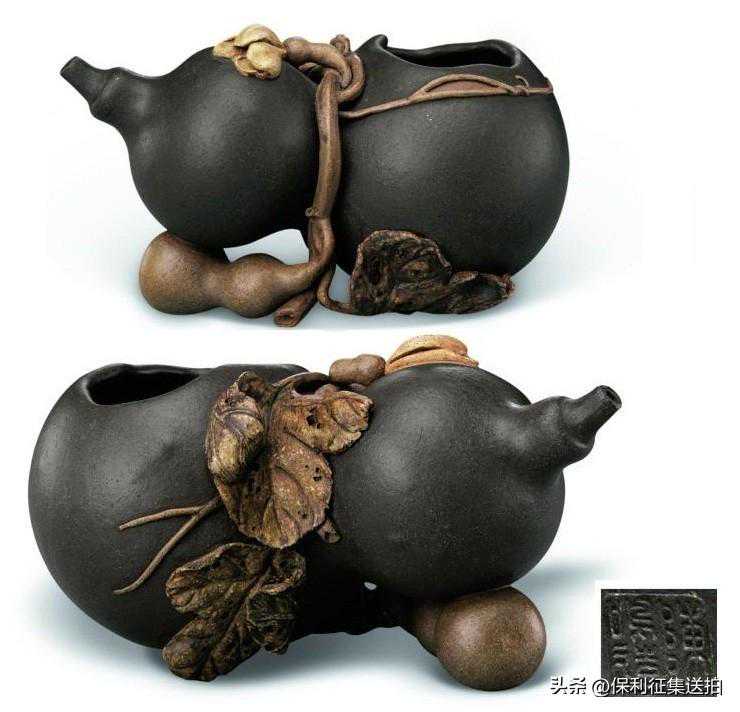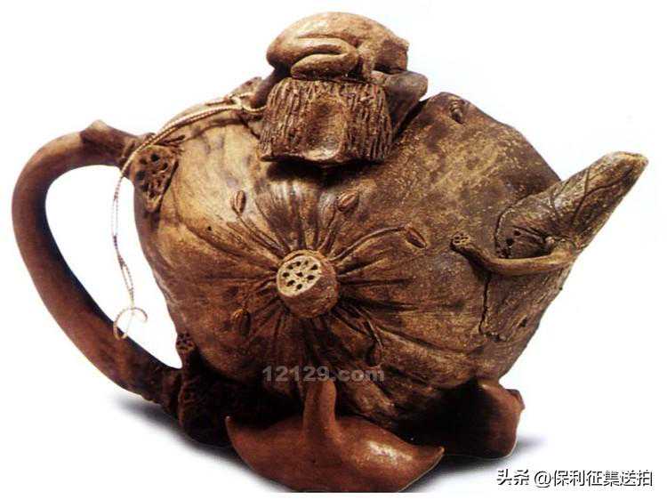 该壶以瓜身为壶体,瓜藤为壶把,瓜叶为壶嘴,叶脉藤纹瓜叶卷成嘴,