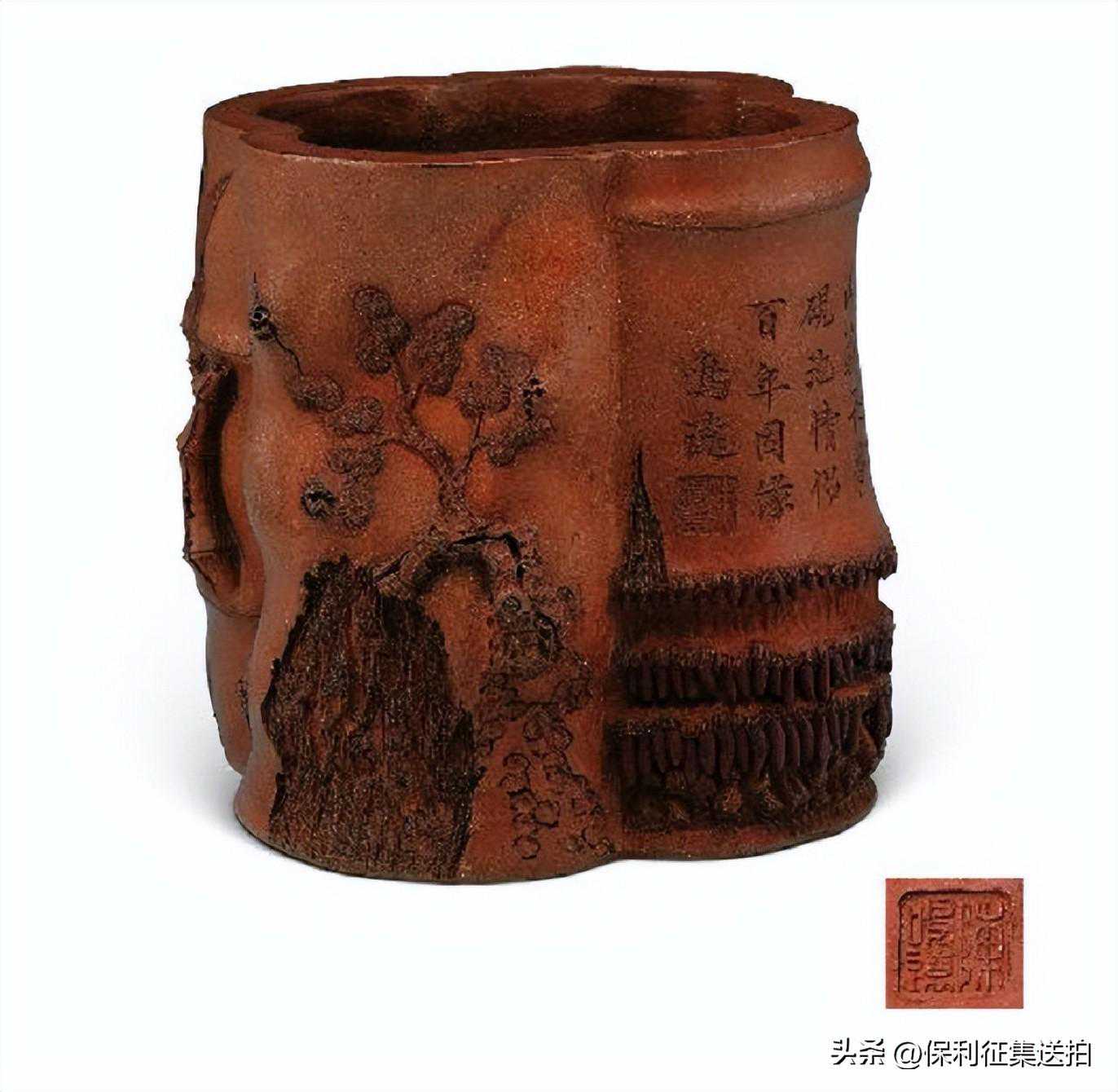 8,明末清初陈鸣远製紫砂松竹梅笔筒
