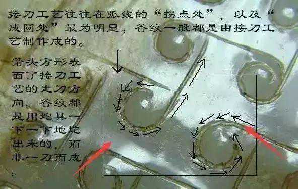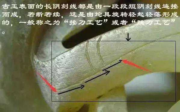 所谓接刀工艺简单概括就是:古玉表面的长阴刻线都是由一段段短阴刻线连接而成,若断若续,这是由坨具旋转轻起轻落形成的,一般称之为“接刀工艺”或者“跳刀工艺”。