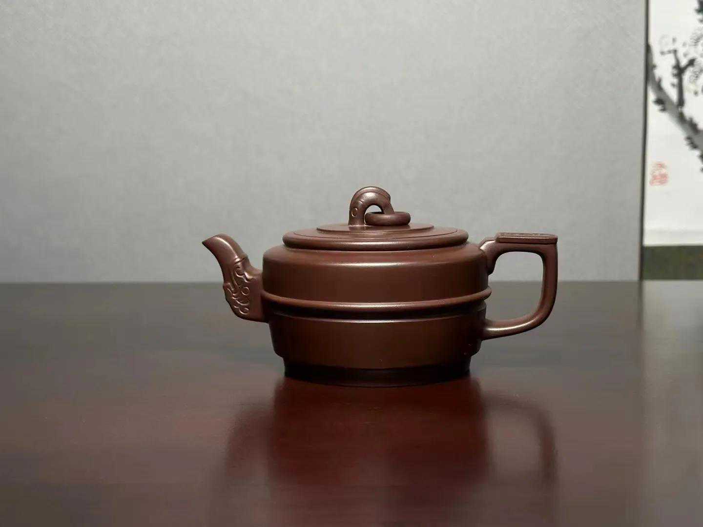 壶身呈圆柱形,身筒饱满,轮廓清晰,重心沉稳,给人以庄重之感,壶身中间以凹凸线分界束腰,状如两块大玉璧叠合而成,嵌盖形似圆璧,拱形桥钮如同一条小龙,腾空而起,壶钮饰以圆环,极具动感