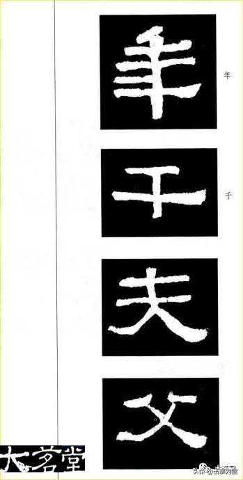 《张迁碑》中的竖,起笔有方圆的变化,方多圆少,中锋涩进行宅,有提按的灵动变化,竖势有直侧的变化。如图三“之”字的竖,逆锋方起笔,调锋(一般是拇指向外,食指、中指向内稍捻笔管,手腕稍向上弓,以凋正笔锋)后向下直而涩行。“九”的竖(《张迁碑》中“九”字的撇作竖处理)逆锋方起笔,调锋后用力向下涩行,笔势渐重,回锋收笔。“上”字的竖则逆锋圆起笔,向下涩行。“辅”的两长竖行笔中均有明显的提按变化,轻灵活泼。图四“东”字的中竖,曲而不显怯弱;“外”的竖向左下倾斜;“干”字的竖向右下倾斜;”喋”的下竖向左下行笔,带有一定的弧势。还有更多短竖的不同变化,这些大大丰富了《张迁碑》竖的内涵,显示出独具匠心的艺术特色。临习时宜细致观察体会,认识这些变化,再付诸宅墨。其实任何一个笔画,都没有固定的形状,其长短、粗细,正侧、方圆应随字势而巧妙变化,万不能干篇一律。只有在此基础上认真体味汉碑,才能享受其无穷变化的奥妙之趣。