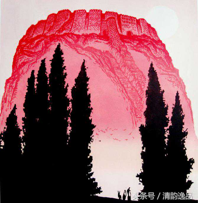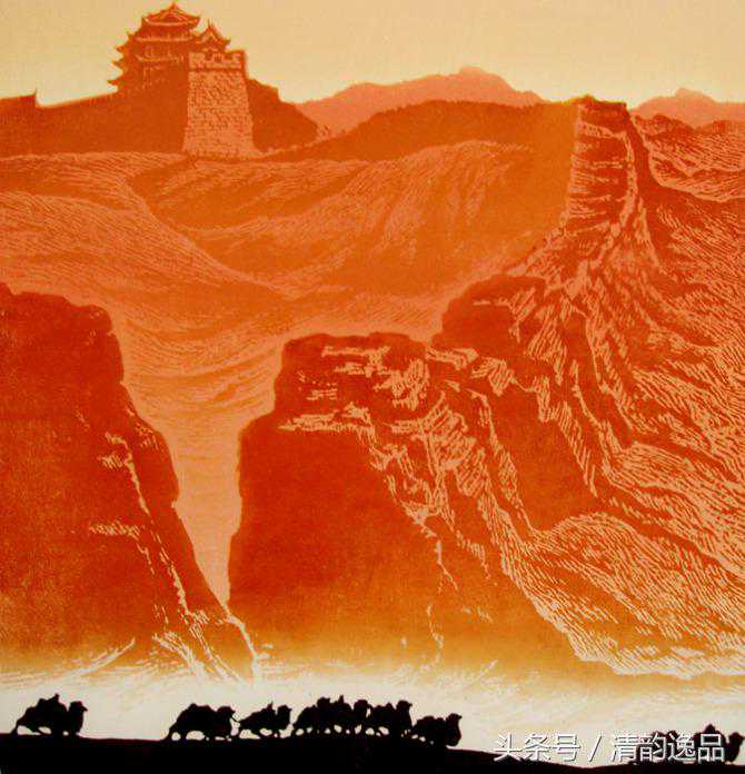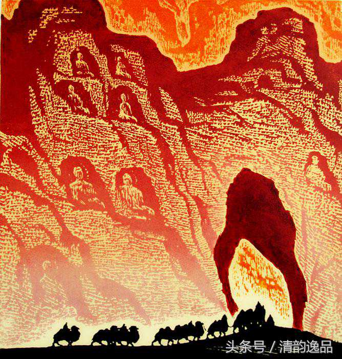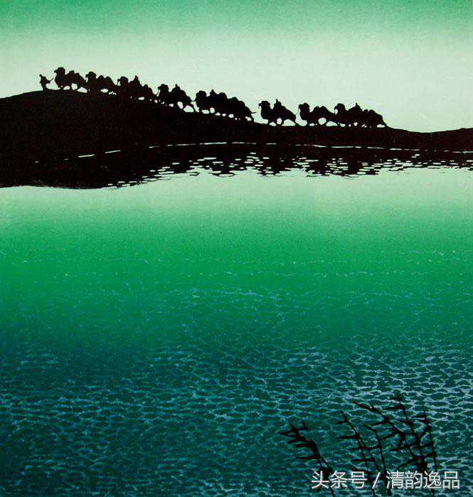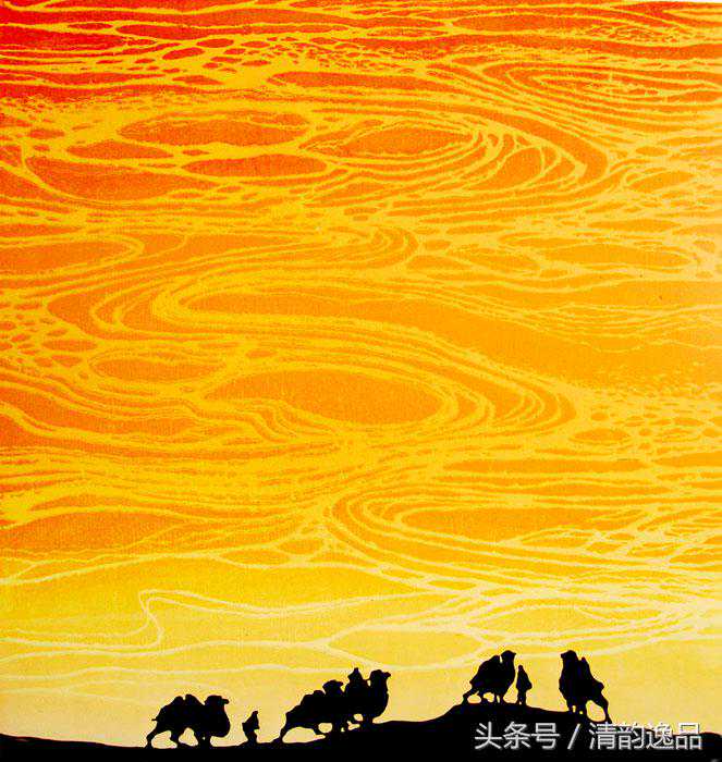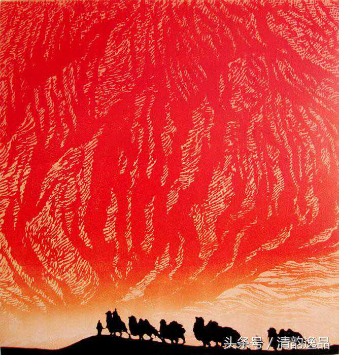戈沙的艺术,常能给人带来诗的意境,带来崇高美的启迪。在戈沙刀锋笔下,山河的壮丽之美,驼队的奋进搏击,胡杨红柳的生命抗争,都传达出一种崇高美的意韵。“苦难是一所最好的大学”,戈沙对高尔基的话极有感触。金色的童年在凄苦中度过,激情的青年时代又饱尝政治风暴的艰涩,岁月熬人催人,也磨炼人的意志,锤炼人的思维。年龄的增长老化并没有泼灭生命的活力,反而使画家体验了人生。更加成熟深沉,审美的层次更升华。或许,在理论上并非十分自觉,但创作实践中戈沙的艺术审美理想已经走向了壮美与崇高的范畴,艺术已经向更深的精神层次追求,而艺术语言也自然地倾向更加概括、夸张,风格更趋沉雄大度。
