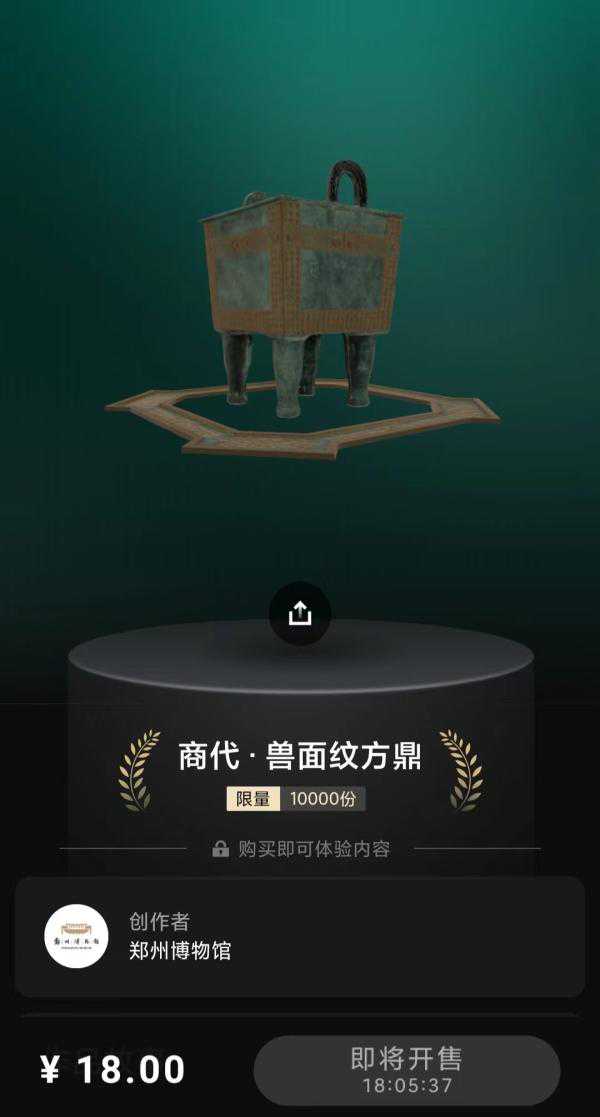 8月25日,郑州博物馆将首次推出以馆藏精品文物“兽面纹方鼎”为原型打造的数字文创藏品,限量10000份。用户可通过「鲸探」小程序或下载「鲸探」APP购买。