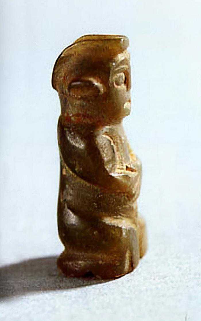 新石器时代玉人佩着重刻划人物的大眼、大鼻、大嘴;线条简单。玉人上均有穿孔。