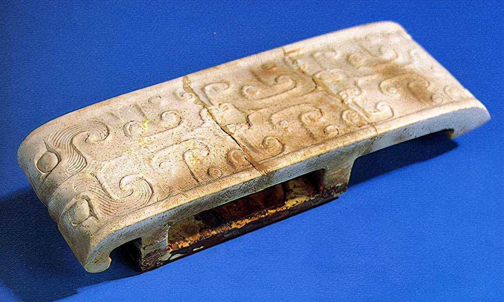 剑璏:俯视呈长方形,侧视长方的两端下弯,亦有无下弯部分,中有孔。早期上部略厚,孔小,两侧下垂少,西汉上层薄,孔大,两侧下垂多。器上都有纹。