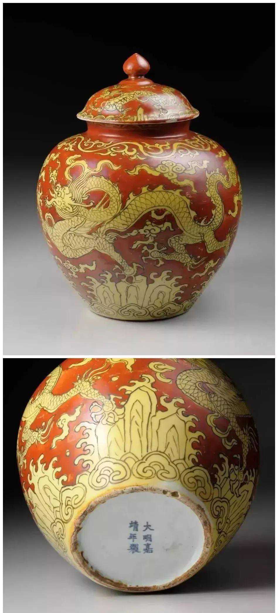 明嘉靖黄地红彩龙纹罐