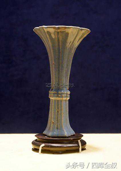 蓝哥釉花口花觚,通体修长,口、足为外撇五瓣花形,中部束腰。哥窑为宋代五大名窑之一,历来为后世所仿烧,清代唐英《陶成纪事碑记》中有“仿铁骨哥釉”记载,在仿制的基础上还创烧了一系列新品种,如蓝哥釉。另外,哥窑瓷器以仿古代造型的器物为主,此件器物从造型到釉色,均是仿造青铜觚,孕育着浓浓古意。通体满施蓝哥釉,釉光晶莹,釉质肥润,开片形如冰裂,疏密有致,韵味幽远。全器自然古雅、别具一格,存世罕见珍。