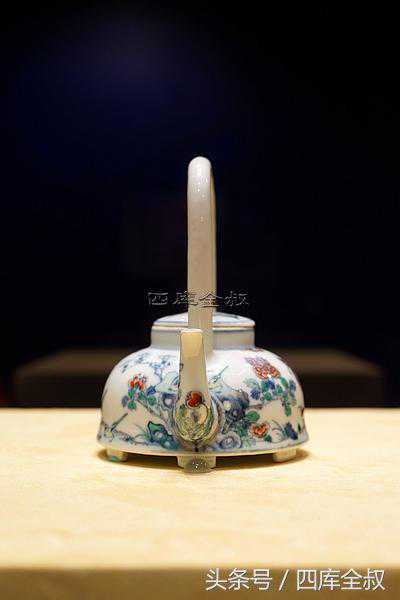 这把斗彩五伦提梁壶的造型独特,工艺复杂,成品率很低。除了壶身制作难度大之外,其装饰工艺也十分精湛,壶身上的图案采用了斗彩工艺。也就是先用青花勾勒出禽鸟和花草的轮廓线,然后入窑高温烧制青花部分,出窑后,工匠再在青花轮廓线内涂以各种彩釉,最后二次入窑低温烧制五彩部分。这把斗彩五伦提梁壶才算制作完成。