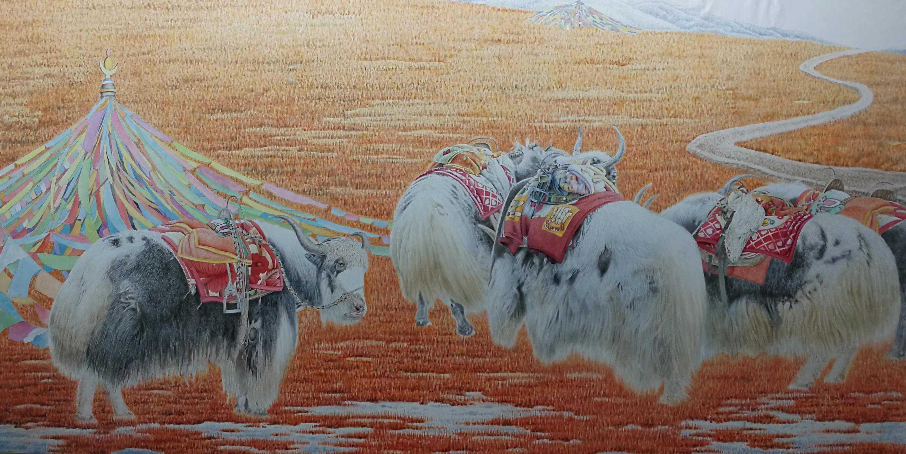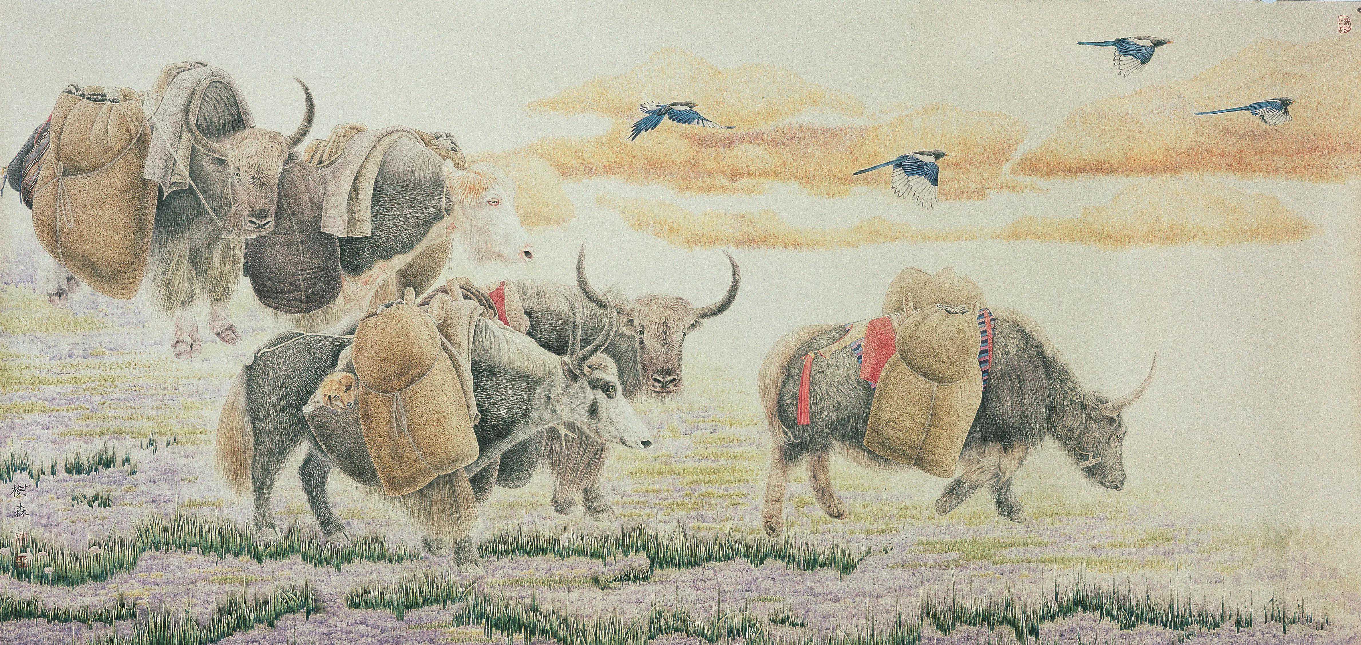 绕了这么一个圈,只是想说明,常老师绘画中的牛的神韵,是非常高妙的。作为大幅的中国工笔画,作品本身就是时间,热情,技艺与专注的集合体之杰作,画幅中众多的牛的同与异,无数细节,整体布局,色彩的烘托,真的具备了大巧之境。大多数人,均可以从这样工笔细致与宏大述事之中,享受到美感。但最难的是其蕴涵的神韵,既具大巧之飘逸细腻,又合若拙式旷达厚重!格局神韵极高。常老师的画,让人心驰神往,于我而言,好像悠然间重返非洲大草原,旁观动物大迁涉,又似置身于南极最后的极地净土,在无数企鹅间穿行。山水之间,自然之地,动物万类,感受大爱无疆。