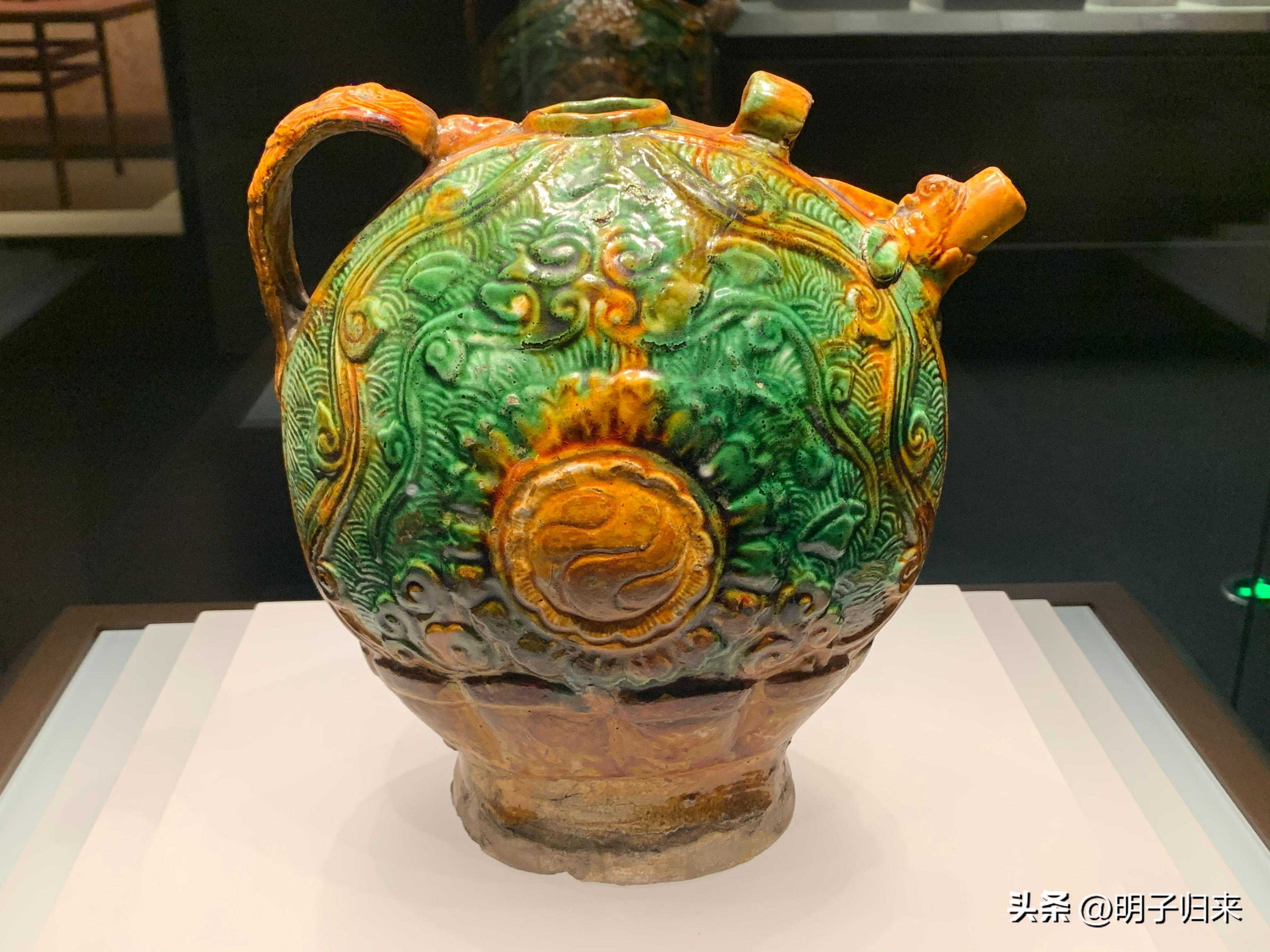 辽三彩釉印海水流云纹扁把壶(这是我迄今所见最美的三彩)