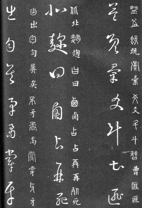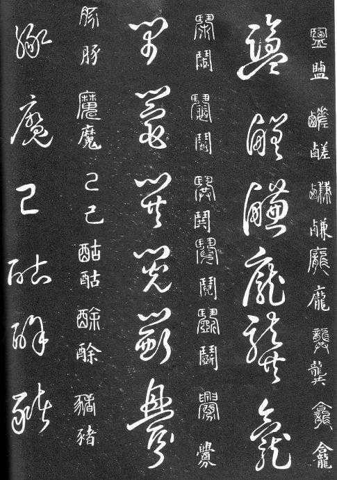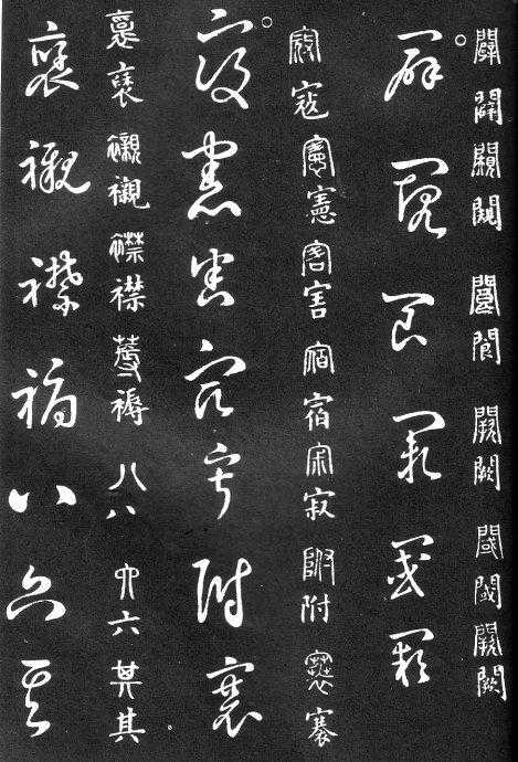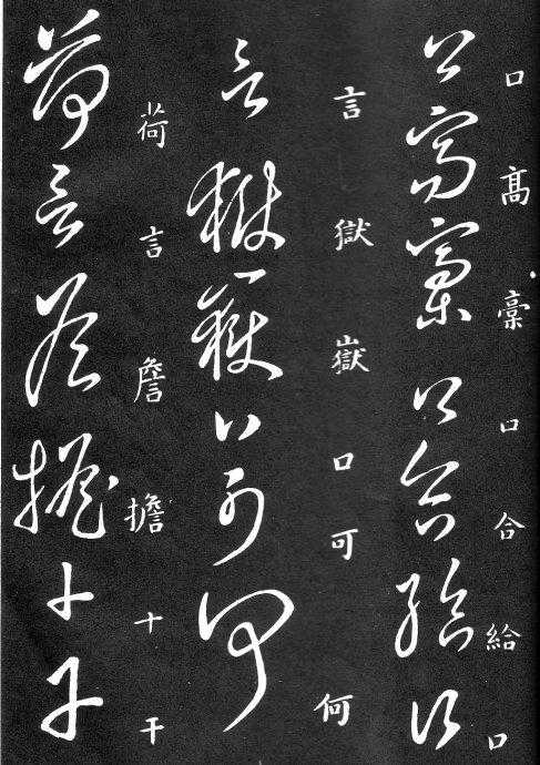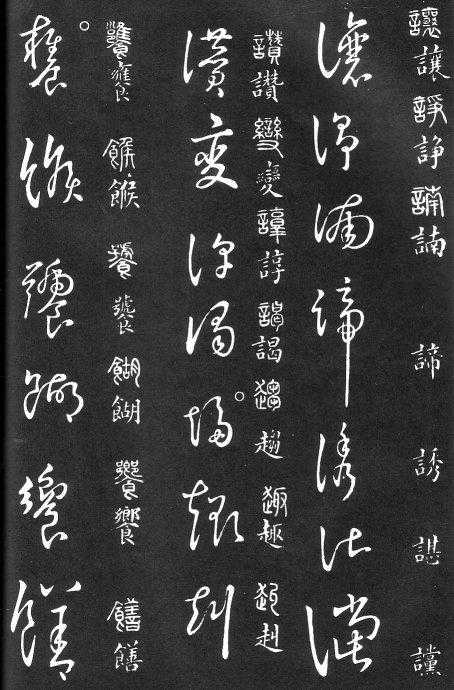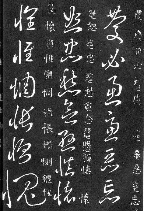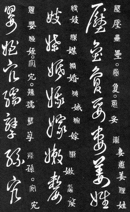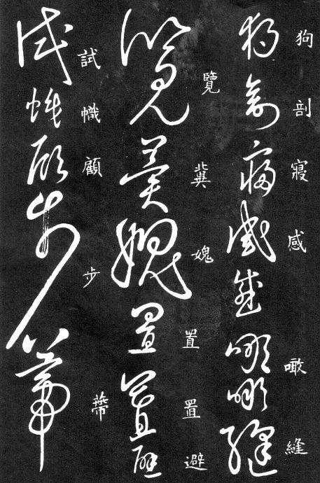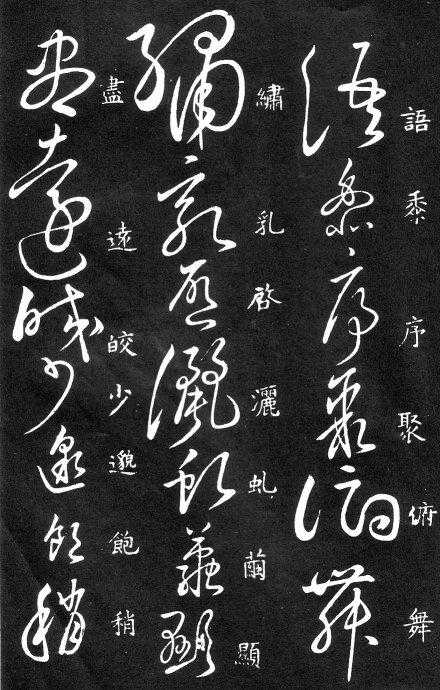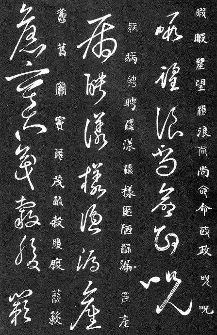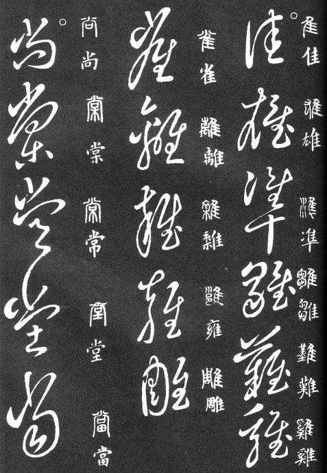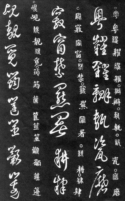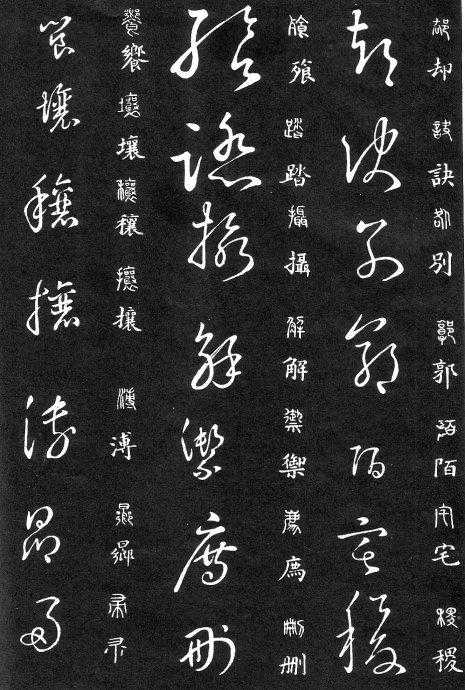 草书在唐代出现了以张旭、怀素为代表的狂草,成为完全脱离实用的艺术创作.狂草亦称大草,笔意奔放,体势连绵,如唐朝张旭《千文断碑》、《古诗四道》,怀素僧《自叙帖》等等,,张旭史称“草圣”,孙过庭《书谱》字字区别,不相连接,而笔意活泼、秀媚。“大草”与“小草”相对称,大草纯用草法,难以辨认,张旭、怀素善此,其字一笔而成,偶有不连,而血脉不断。清朝冯班《钝印书要》谈学草书法云:小草学献之、大草学羲之,狂草学张旭不如学怀素。怀素的草字容易辨认,字迹清瘦见形,字字相连处亦落笔清晰易临。张旭字形变化繁多,常一笔数字,隔行之间气势不断,不易辨认,形成一种独特的风格,韩愈《送高闲上人序》中提到张旭草书以“喜怒窘穷,忧悲愉佚,怨恨、思慕、酣醉、无聊、不平,而有动于心,必于草书挥毫发之”,故学张旭难。