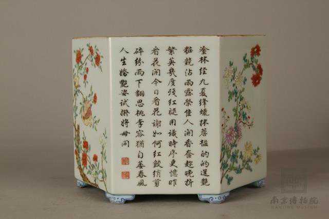 △清乾隆粉彩花果御题墨诗六角瓷笔筒南京博物院藏