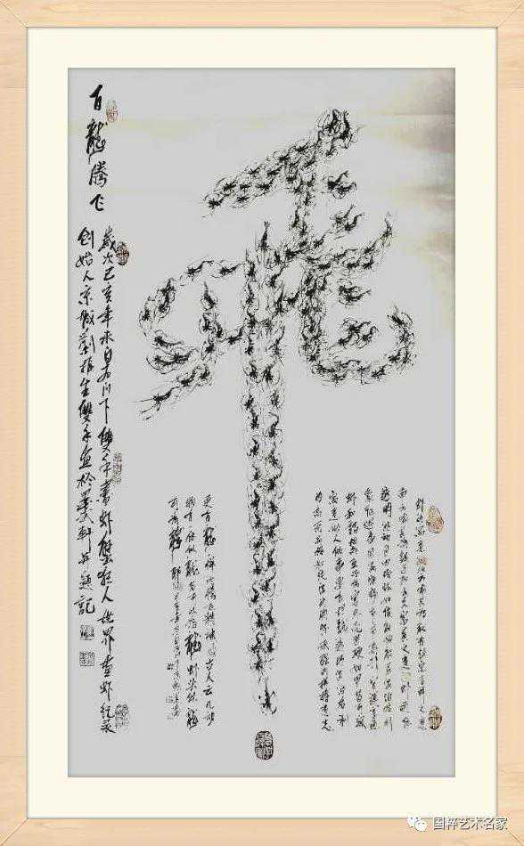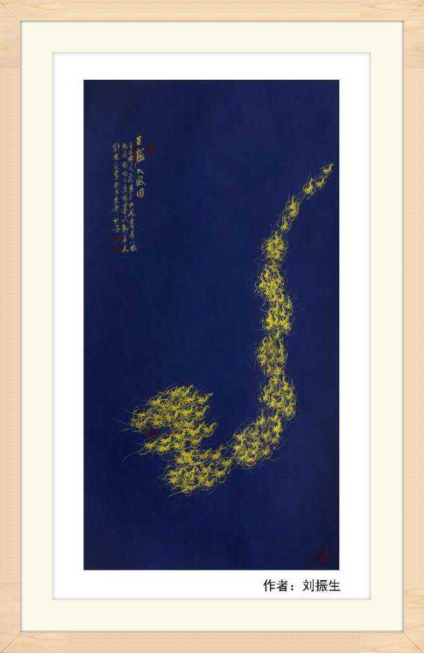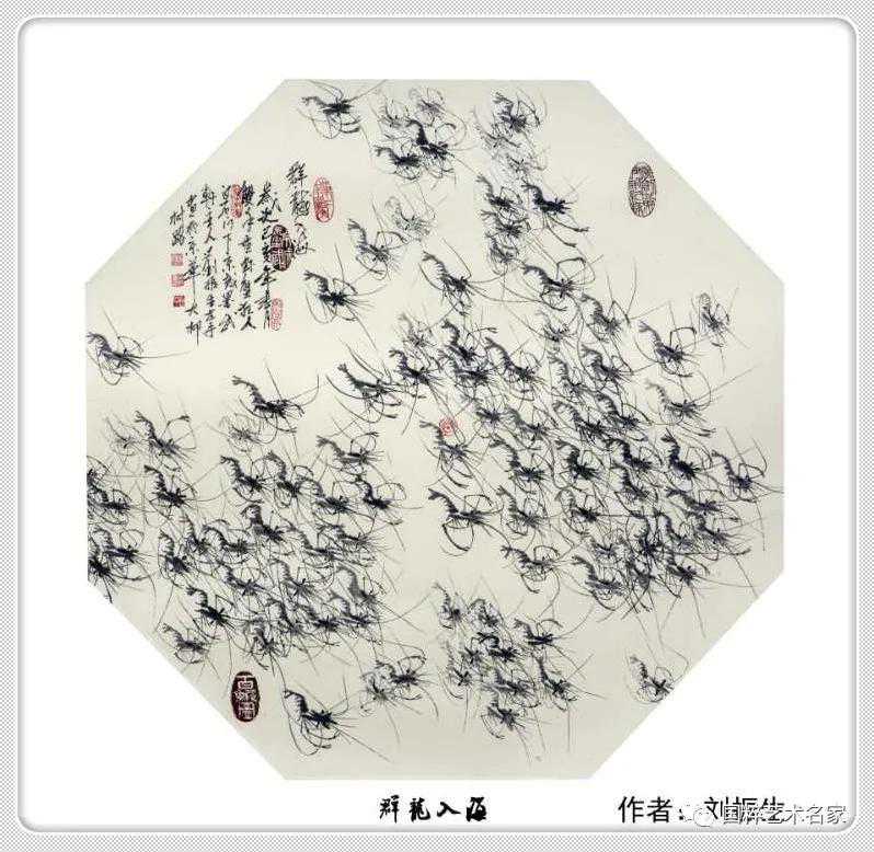 师古不泥古,在继承白石老人画虾技法的同时,刘振生在笔墨上下功夫,遵循以“学我者生,似我者死”白石老人的教诲!从研习白石老人和古人画虾的笔墨纸砚方面入手,逐渐练就了双手同时悬空画虾和双手画(微形)龙字百虾图,有志者事竟成,刘振生的百虾图“远观是条龙,近看百虾游”。如今他左右手持笔画出的虾,给人一种妙趣横生,出神入化,好似万龙游动的画面。白石老人:“画虾贵在游动”,刘振生双手持笔创作的大到一丈二尺、小到扇面的数百幅《龙形》百虾图作品妙趣横生,左右手持笔画《百虾图》的绝技,令世人赞不绝口。