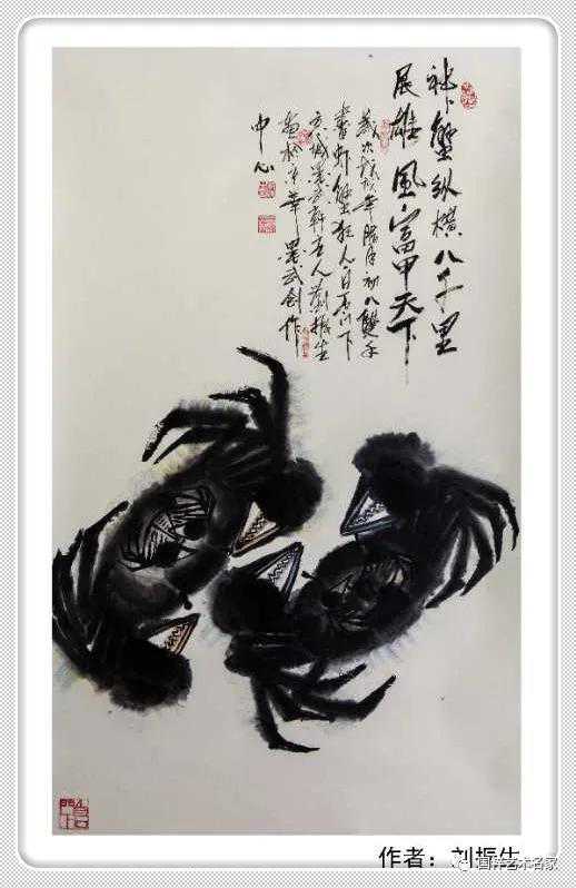 刘振生认为一个人对书画艺术要有执著的信念、勤奋与持之以恒的毅力,刘振生对画虾蟹情有独钟,非常痴迷以观察虾蟹为乐趣,以齐白石老人的画谱为临摹范本,经过二十余年的磨练、笔下的虾蟹形、神、色晶莹透明,栩栩如生,活泼多姿。刘振生看虾通体透明,身体节节高,游动自由、淡薄名利,将发自内心对于生活的爱和大自然美的感受跃然纸上。表明了洁身自好的人生寄托,蕴含了深刻的喻意。