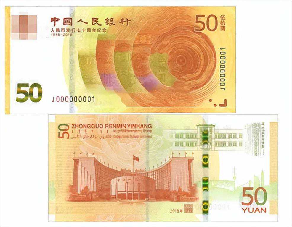 70纪念钞的正面主图案是木制年轮等图案,背面的主图案是中国人民银行大厦、首次人民币发行的公告及城市建筑物剪影等。