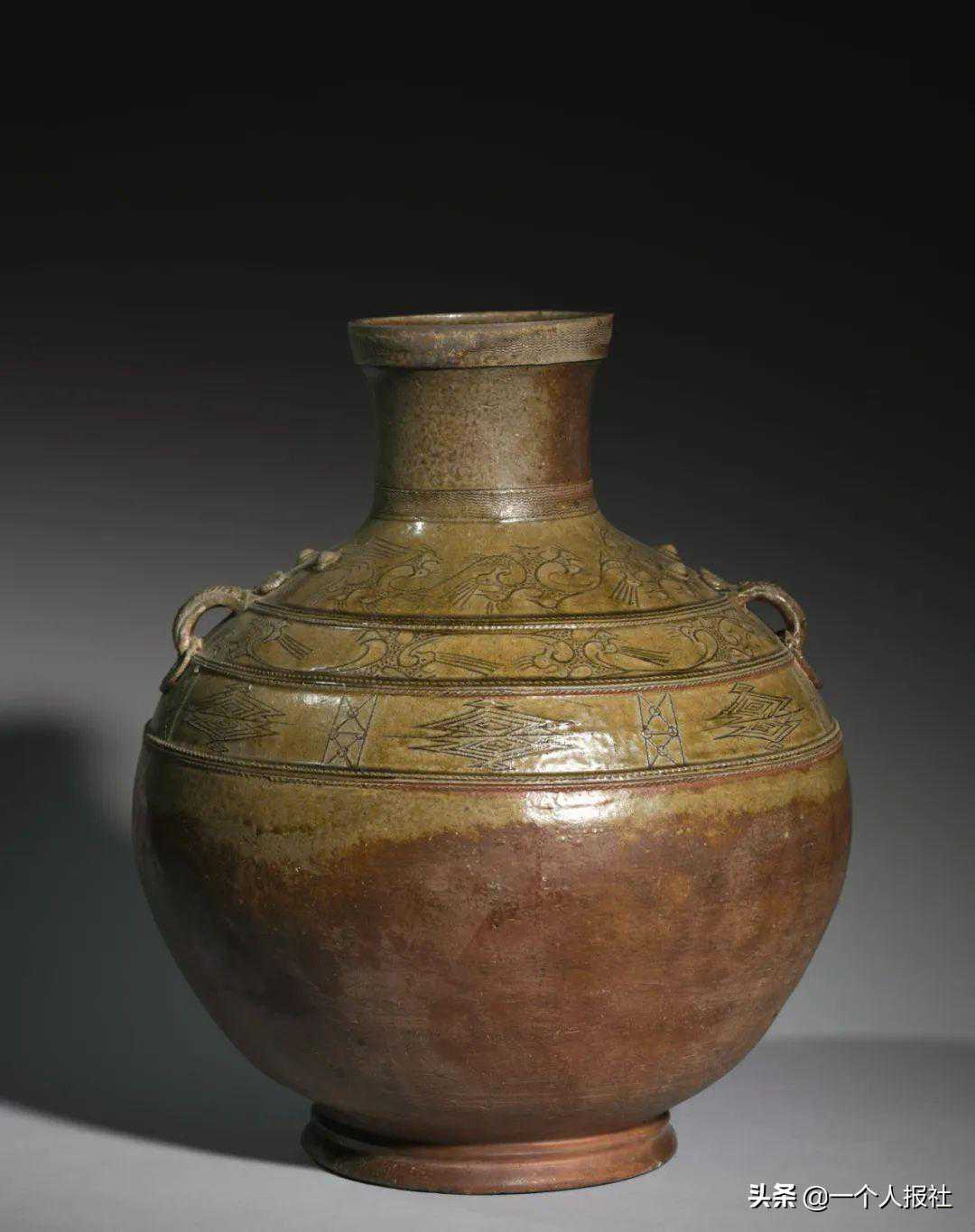 造型酷似青铜器,表面覆盖着一层薄薄的棕绿色釉。肩部三层纹饰中前两周为凤鸟纹,第三排的几何纹饰较为少见。早在商周时期(约公元前1600-256年),中国就有了高温烧造的带釉器物。随后陶工们获得了有关釉料中金属氧化物与窑气之间反应以改变釉料颜色的实用技术知识。