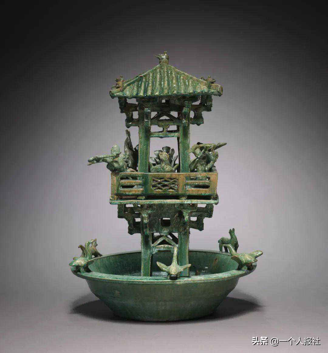 是一件非常精美的随葬器。底部的盘形模拟水池,栖息着水禽与走兽。其中的瞭望塔内有活泼的随从,猎人,音乐家,舞者和家畜,生动地描绘了人间的世俗享受。