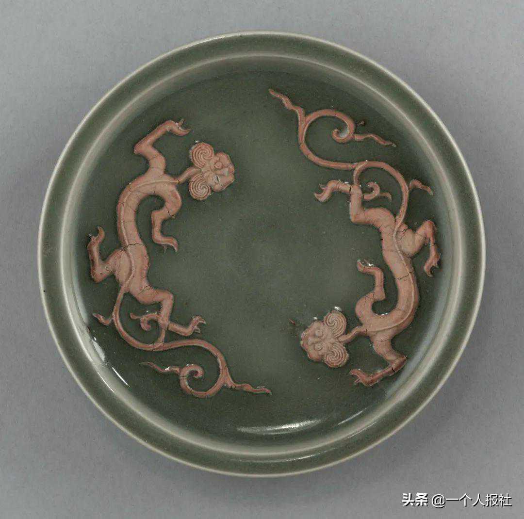 元龙泉窑青釉贴塑龙纹盘