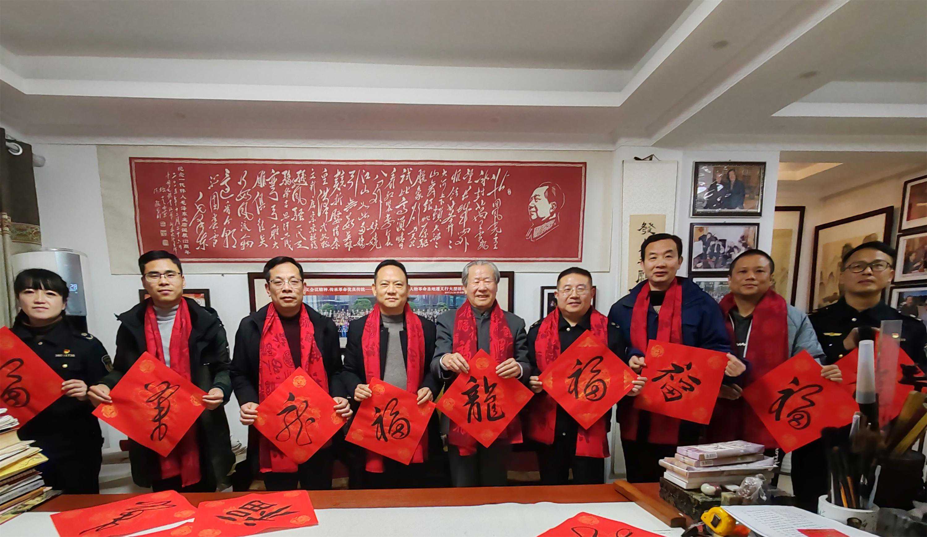 梅楚安感谢省总队领导的关心,为了表达心情,他将自己纪念毛主席诞辰130周年毛体书画集和书写一笔“龙”字、“福”字、“春”字赠送给总队、支队领导干部。大家合影留念,春意盎然,情意浓浓。(文/克龙)