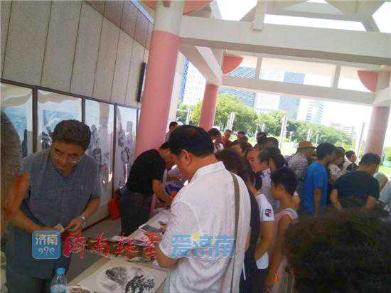 8月12日上午,泉城广场“国际艺术广场”命名16周年纪念笔会在广场东侧文化长廊举行。省城书画家杨忠海、张承源、张明、杜云河、于景平、秦元增、王如恒、范世永、李舸、李锋、刘军等齐聚泉城广场,挥毫泼墨,创作交流,以此纪念济南文化艺术的盛事。