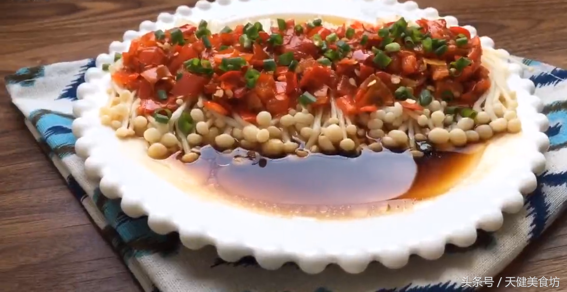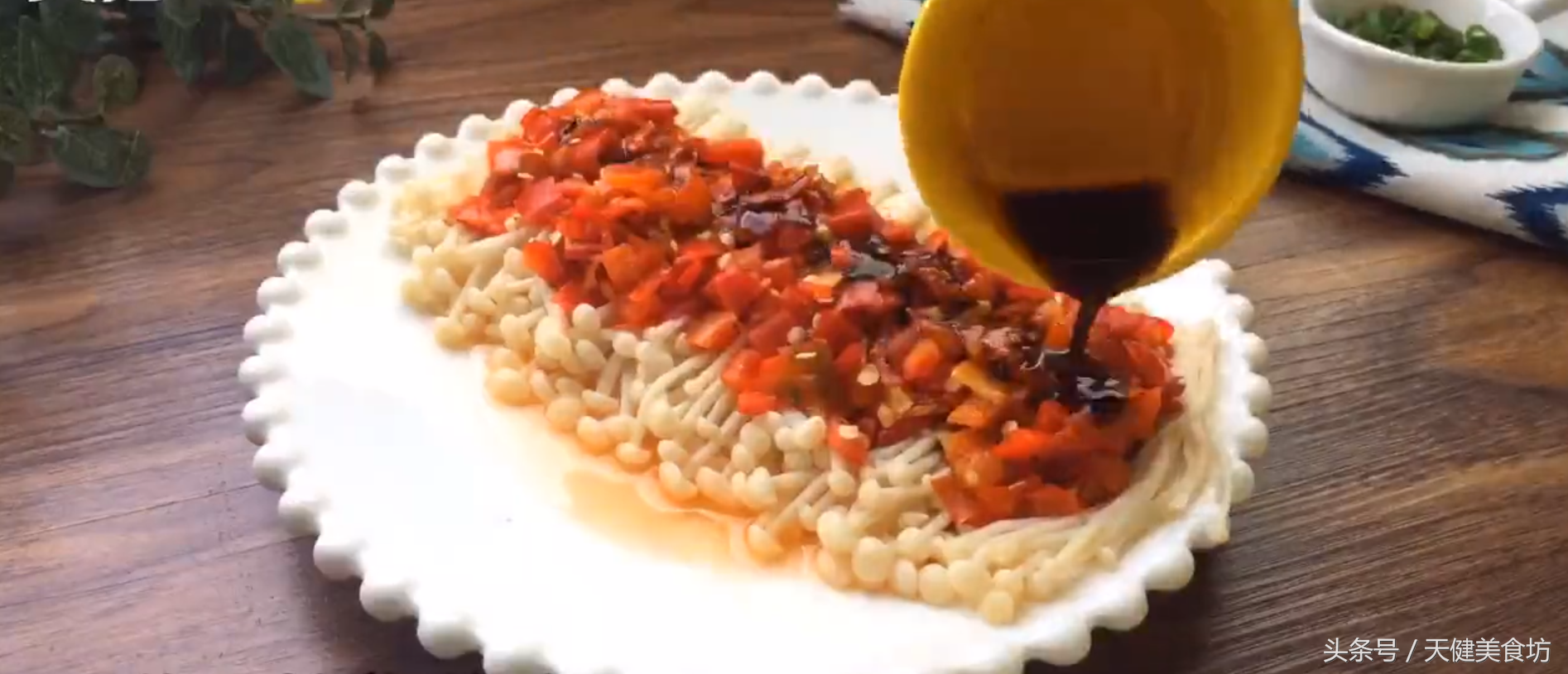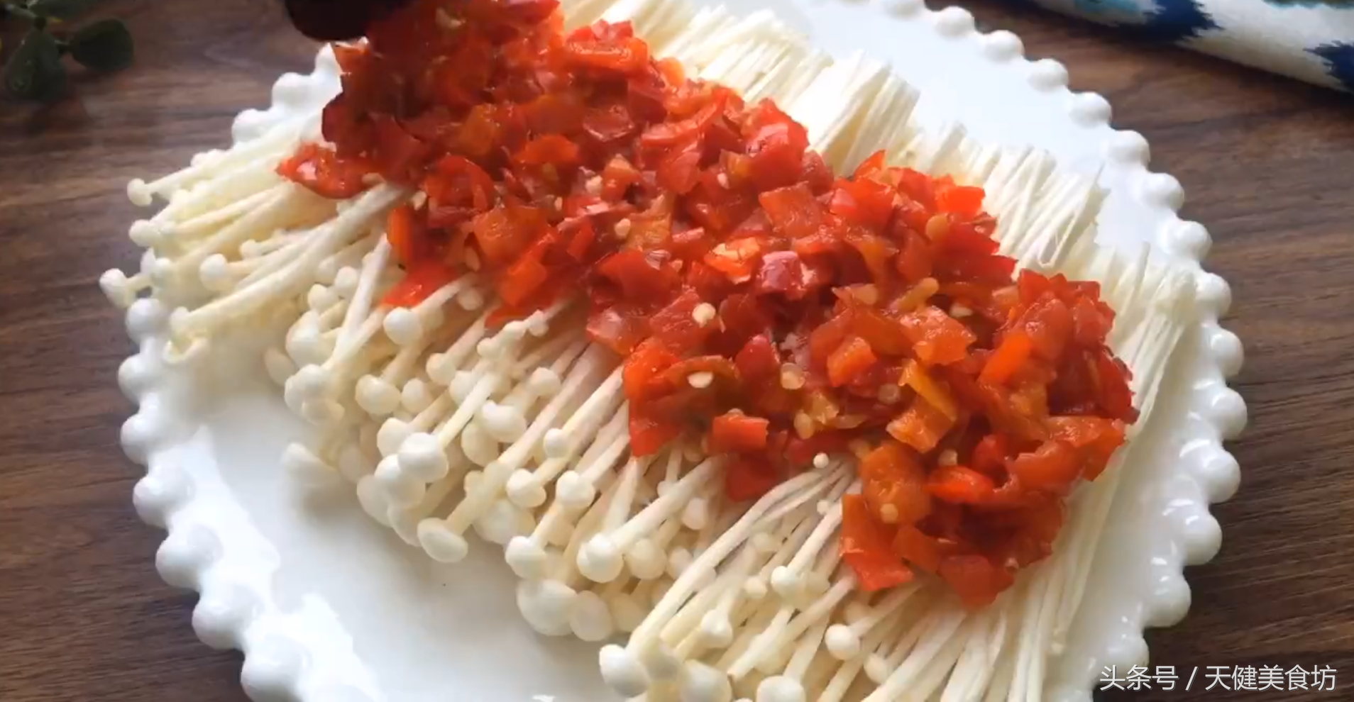等到所有的金针菇都撕散之后,准备一个又大又扁的盘子,把金针菇均匀的铺放在盘子上面,再把准备好的小半碗剁椒,用汤匙铺在金针菇的上面,这样在蒸煮的过程中,可以让金针菇很好的吸收剁椒的味道!