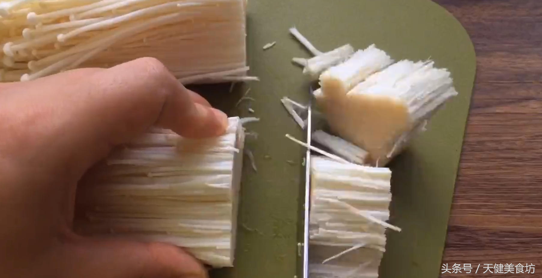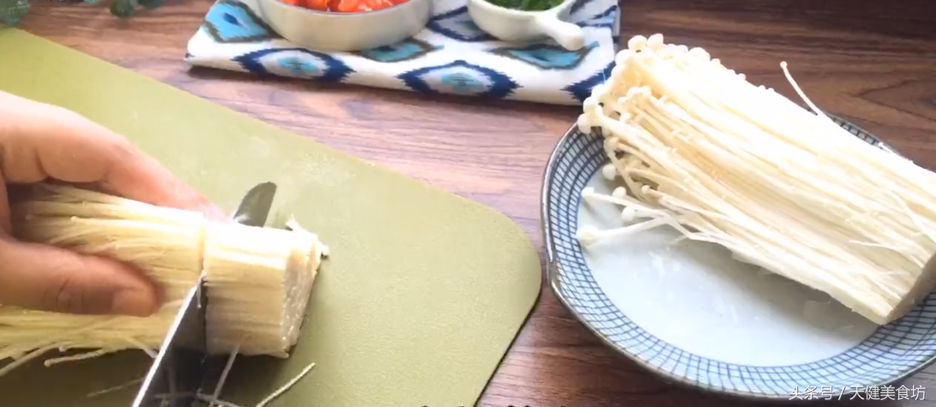 食材准备好之后,我们先处理金针菇,正常情况下买回来的金针菇都是一整朵的,我们要做的就是,先把金针菇,放到水里洗去表面的灰尘,金针菇洗净之后,甩干水分,金针菇甩干水分后,放到菜板上,切去金针菇的根部,然后用手把金针菇撕散开来,撕散的金针菇切记不要搞乱了!
