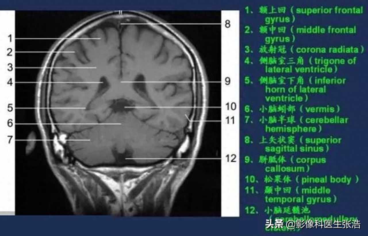 头部磁共振断层(横矢冠状面)图像,附带解剖标注,收藏学习